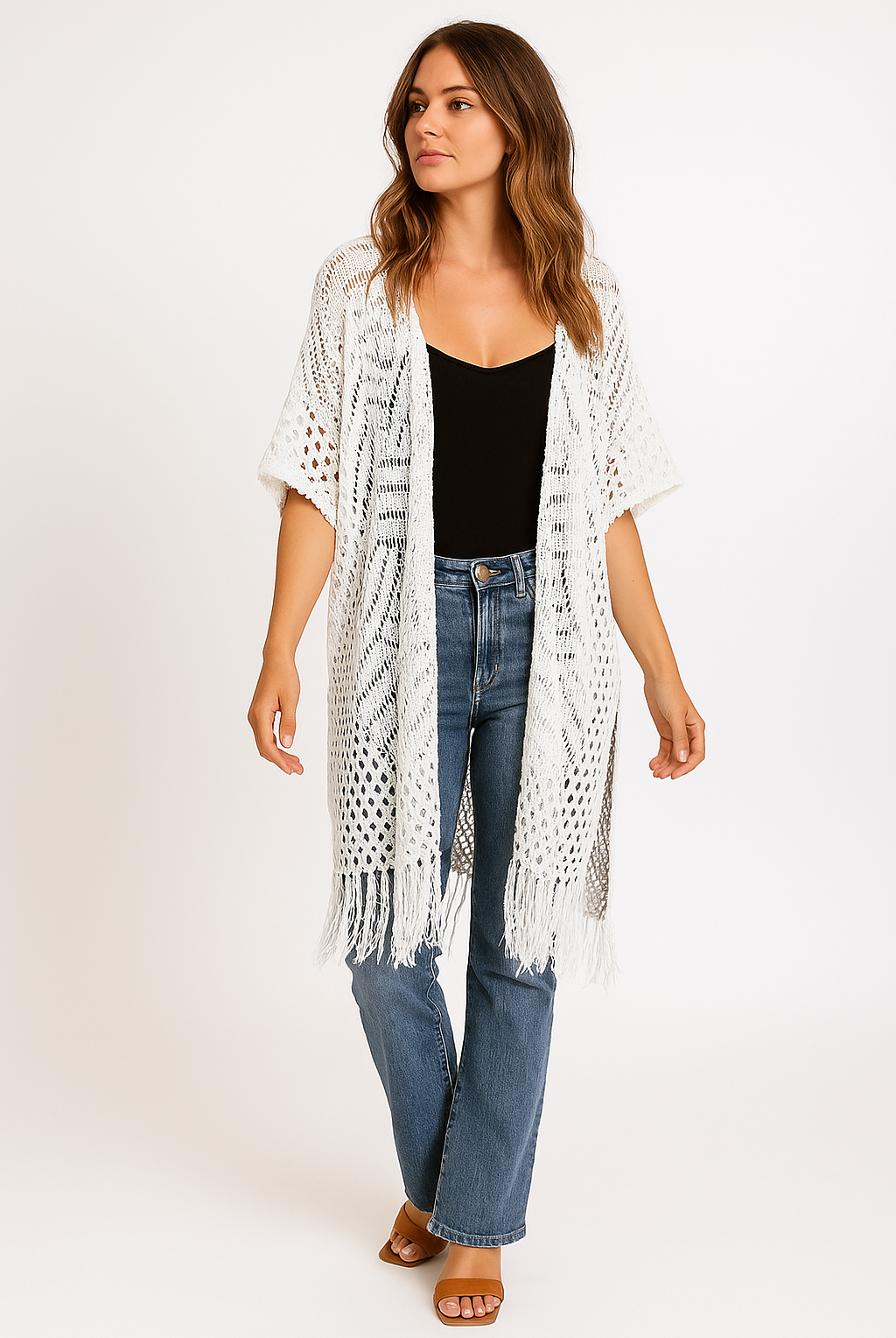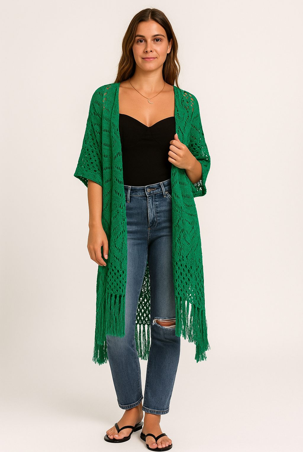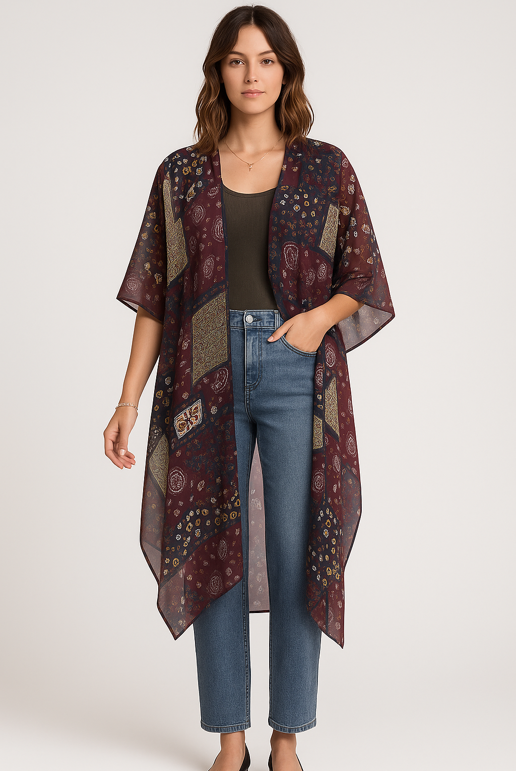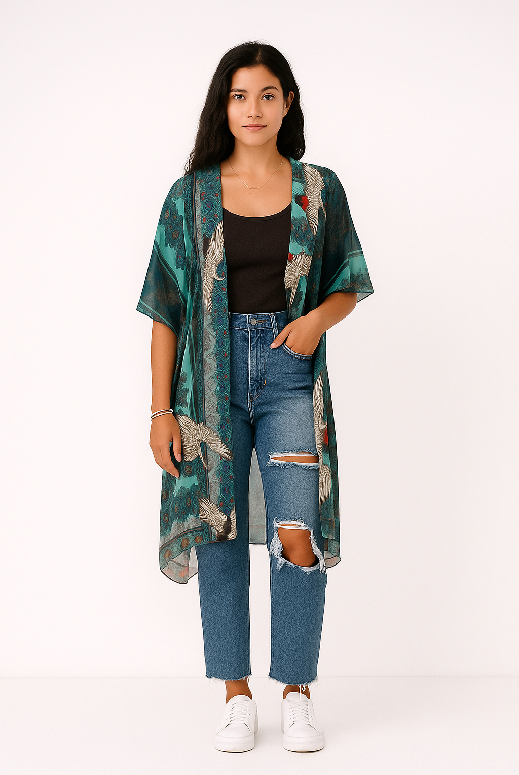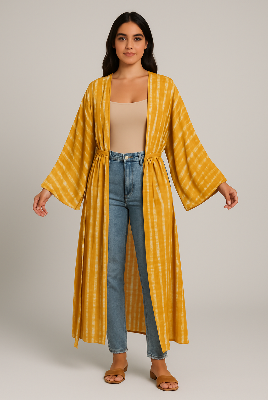 Vous pouvez aussi porter votre kimono sur un short en jean et un débardeur, ou une robe légère. Ajoutez une ceinture à la taille pour une allure plus habillée. Cette version du kimono devient alors une veste d’été fluide qui structure la tenue sans effort.