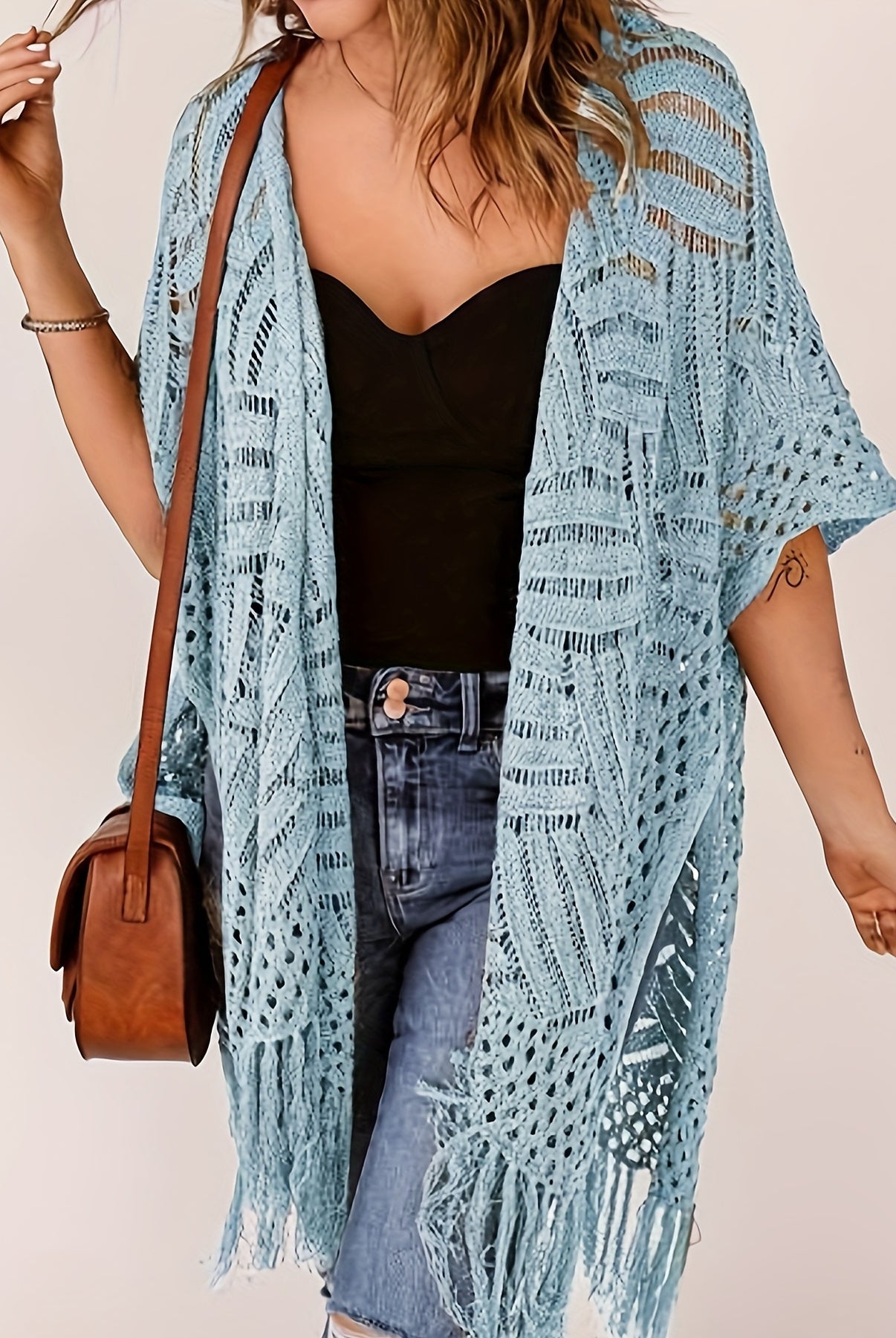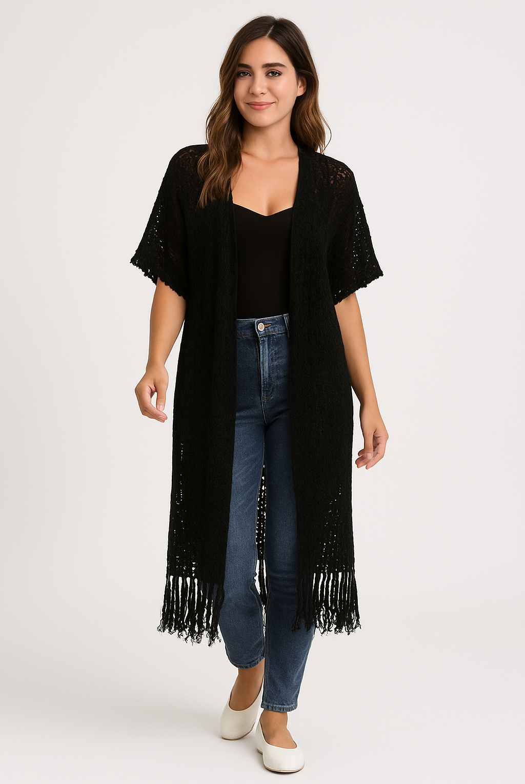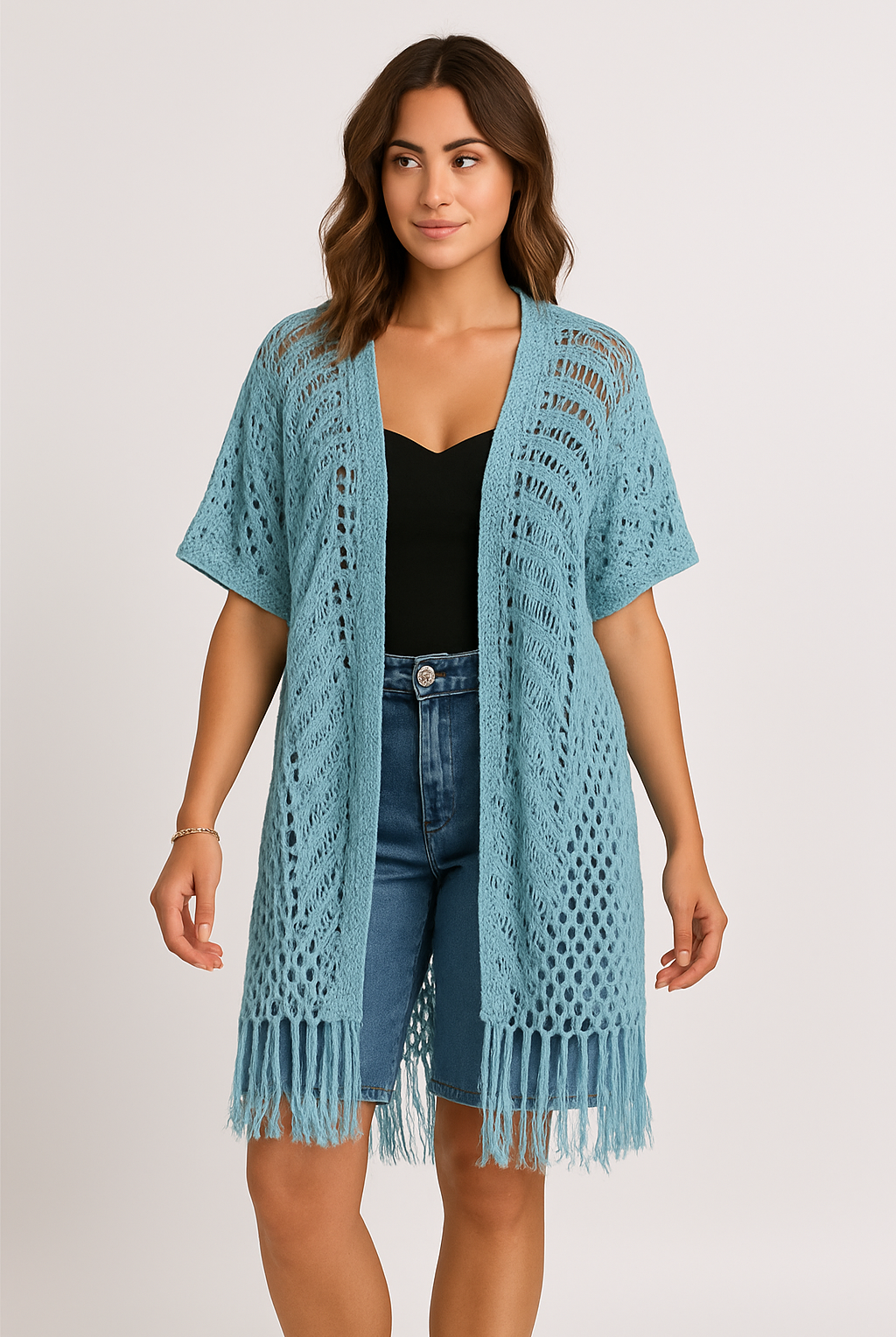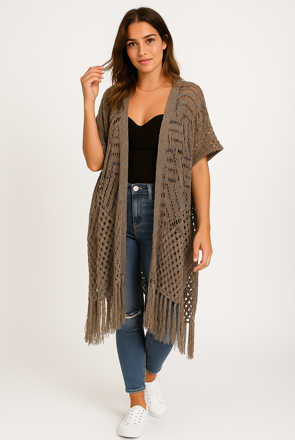 Vous pouvez aussi porter votre kimono sur un short en jean et un débardeur, ou une robe légère. Ajoutez une ceinture à la taille pour une allure plus habillée. Cette version du kimono devient alors une veste d’été fluide qui structure la tenue sans effort.