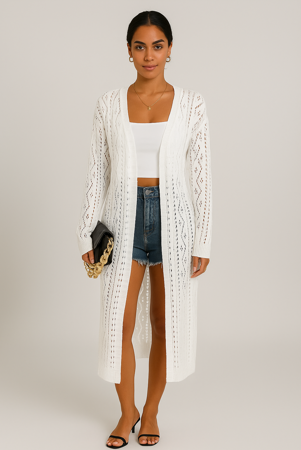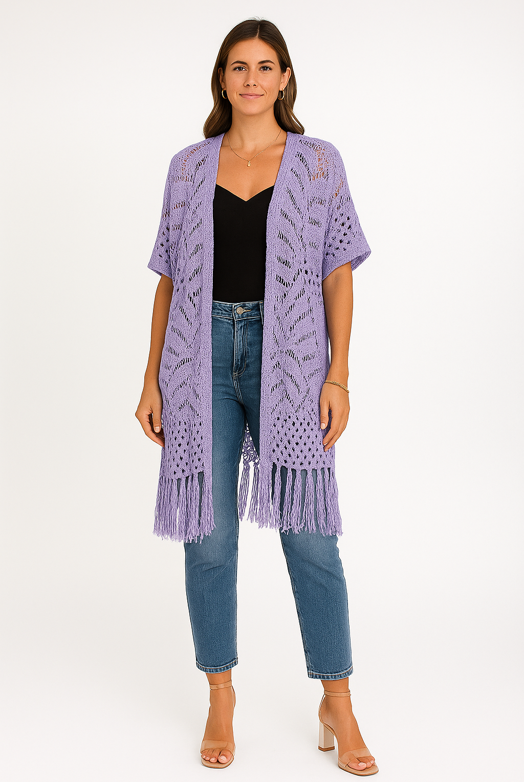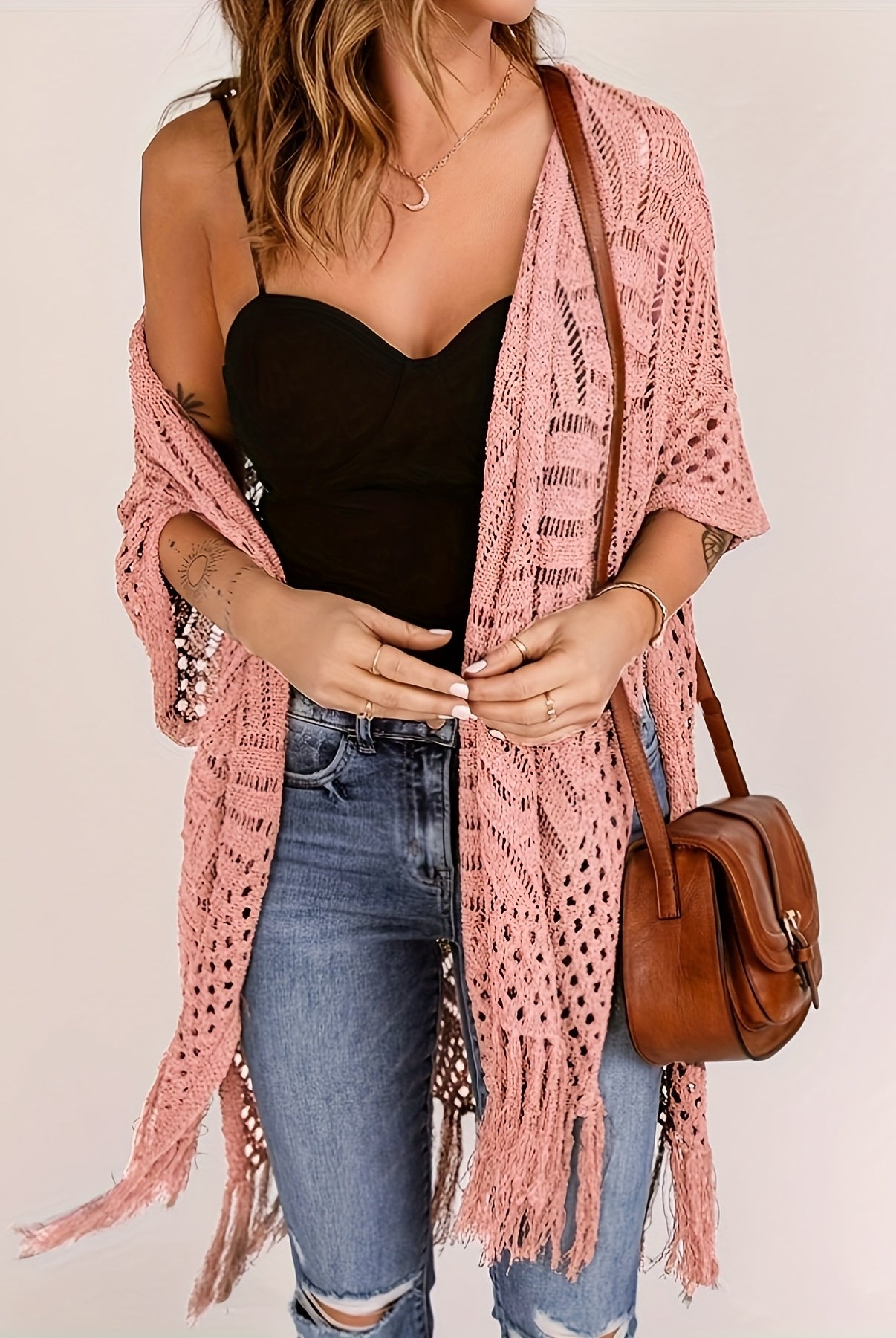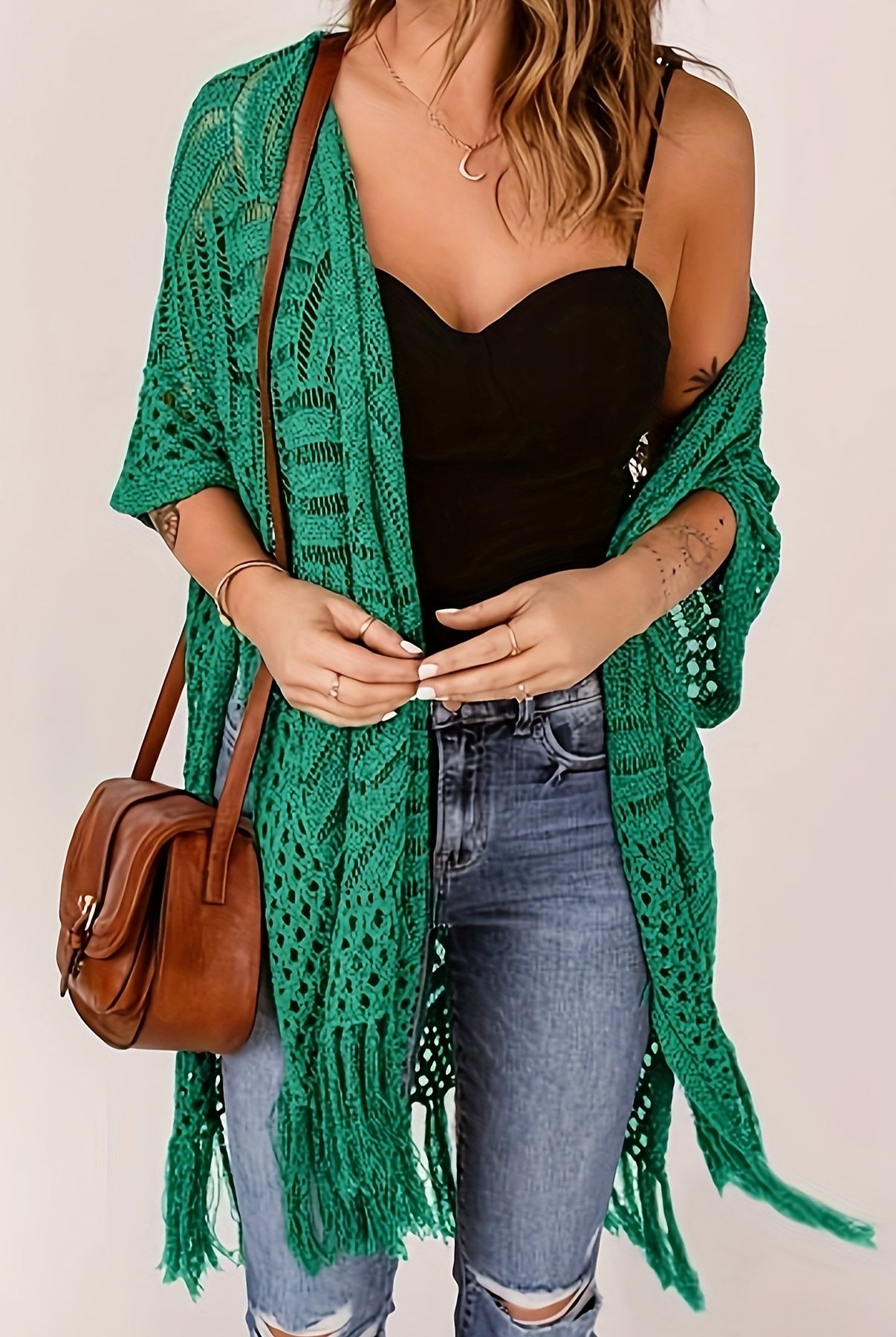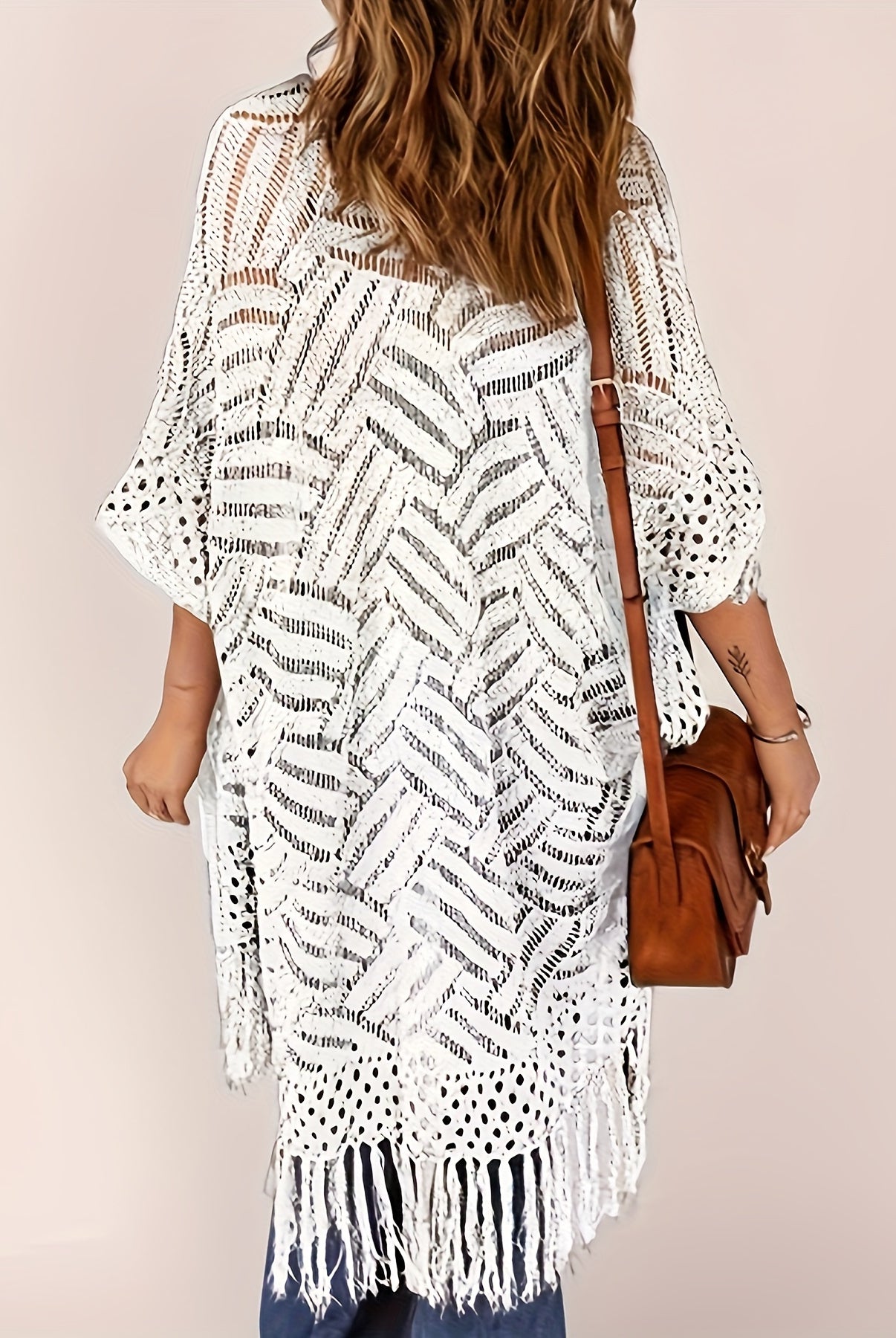 Vous pouvez aussi porter votre kimono sur un short en jean et un débardeur, ou une robe légère. Ajoutez une ceinture à la taille pour une allure plus habillée. Cette version du kimono devient alors une veste d’été fluide qui structure la tenue sans effort.