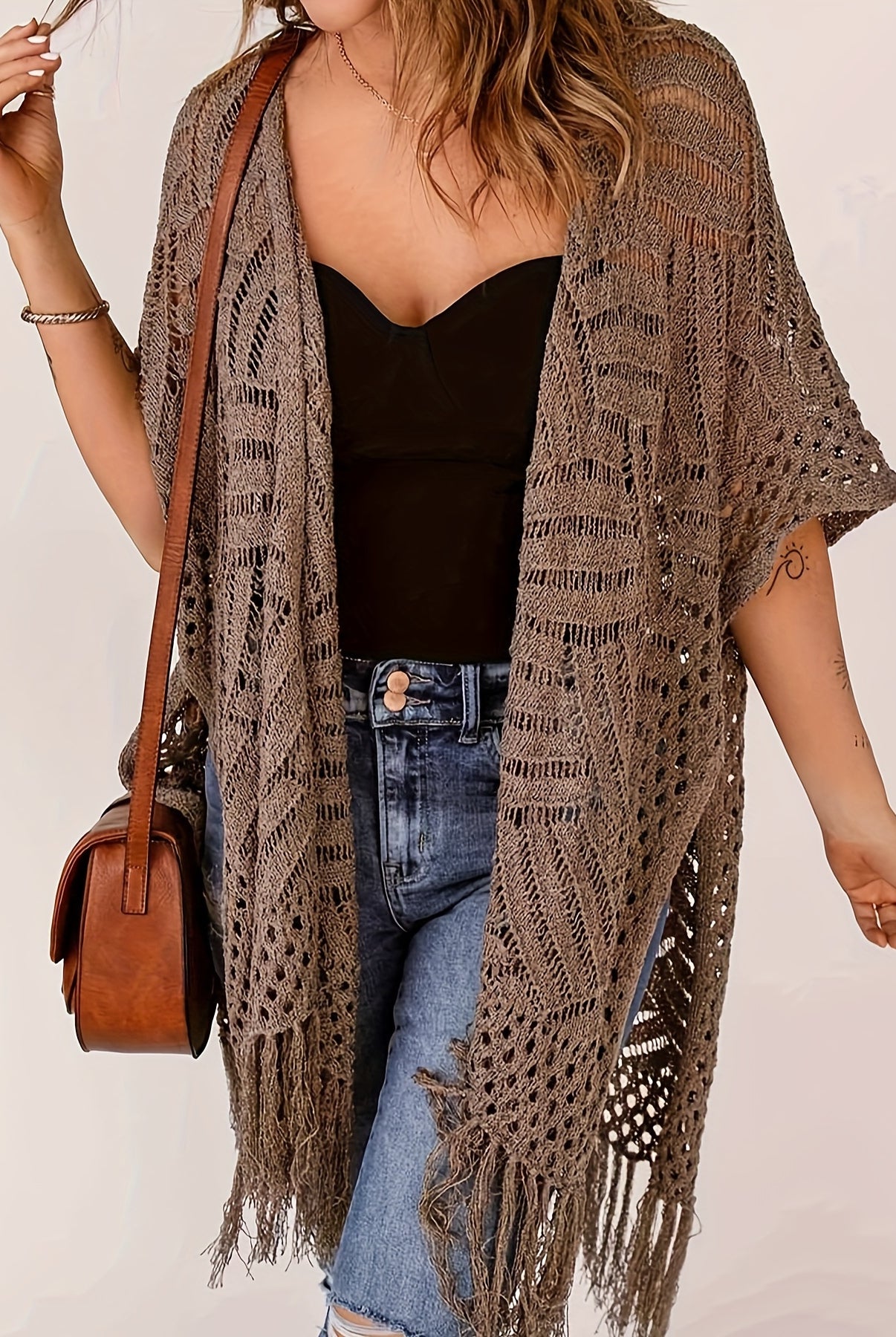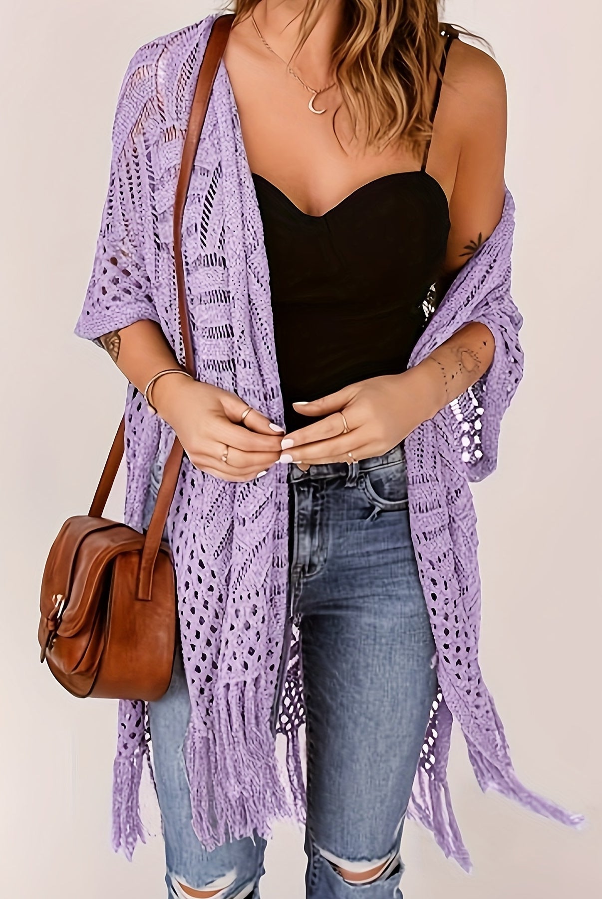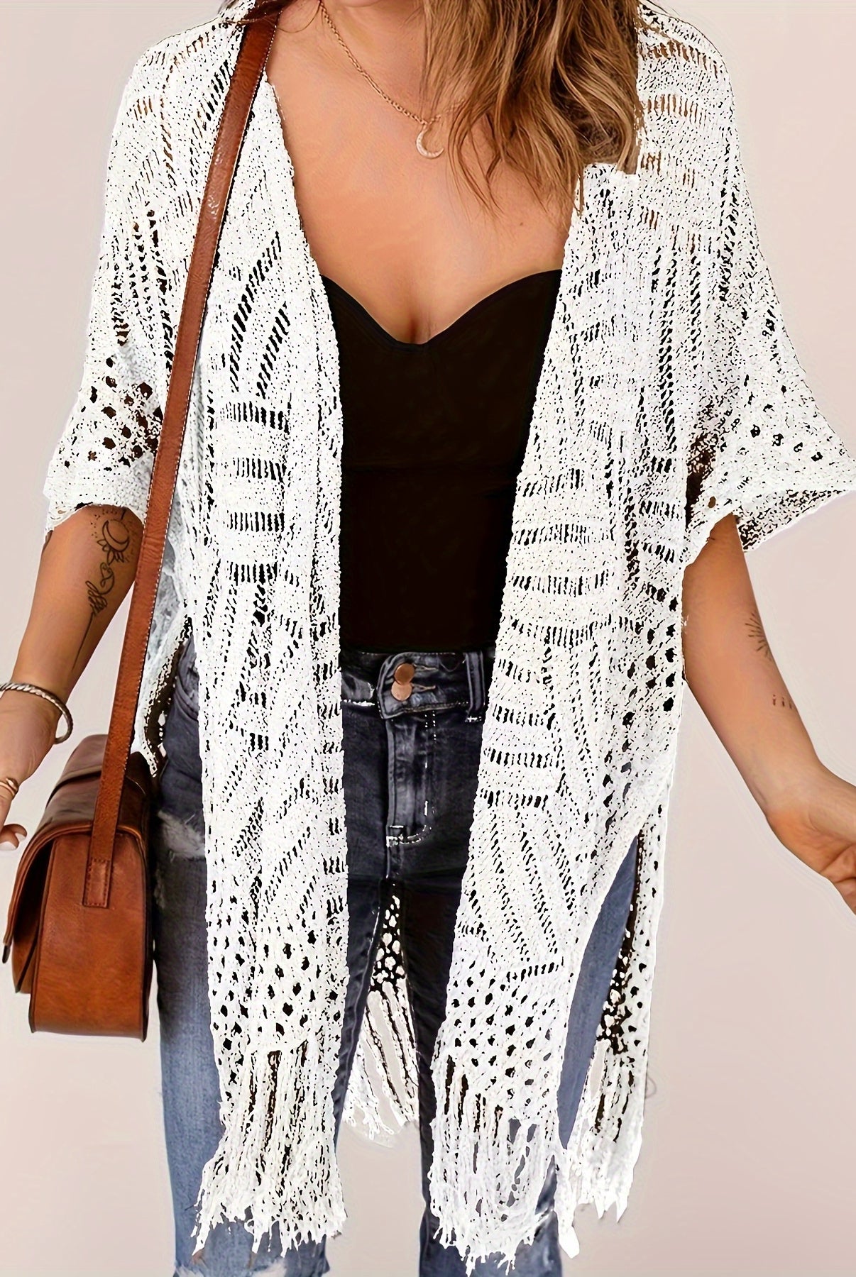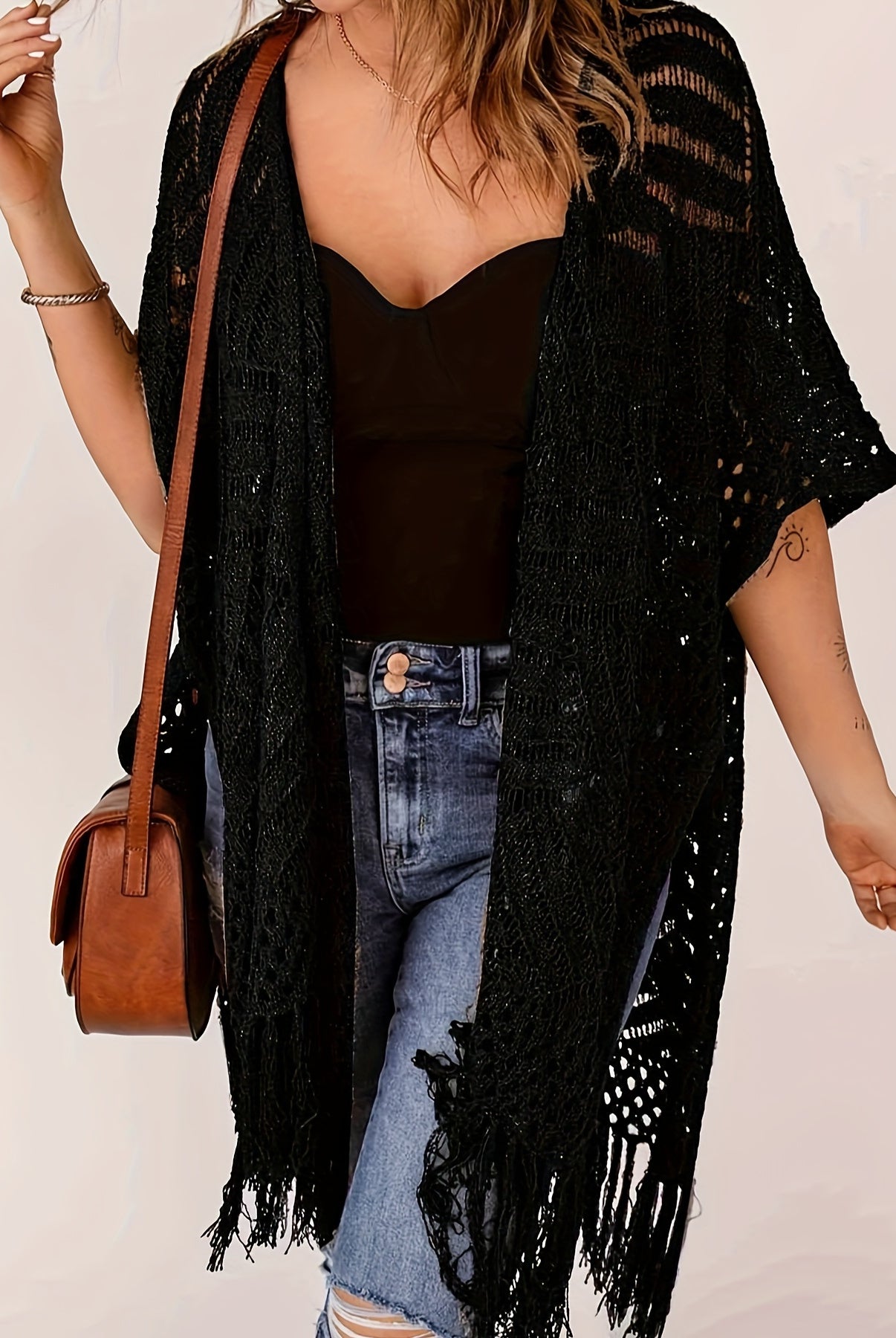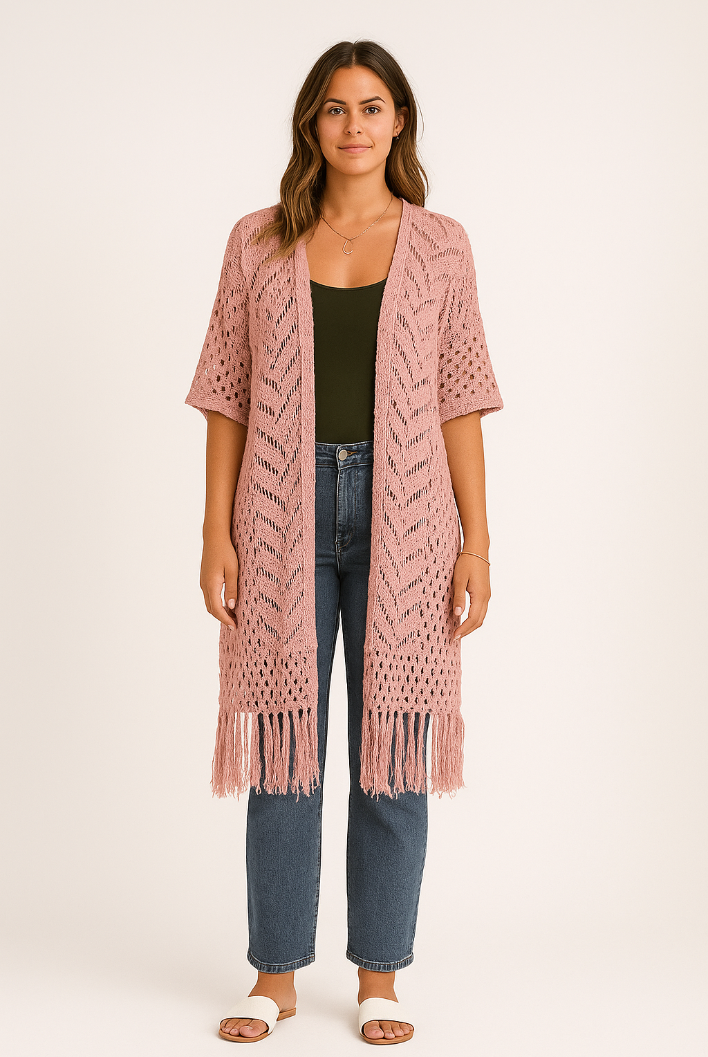 Vous pouvez aussi porter votre kimono sur un short en jean et un débardeur, ou une robe légère. Ajoutez une ceinture à la taille pour une allure plus habillée. Cette version du kimono devient alors une veste d’été fluide qui structure la tenue sans effort.