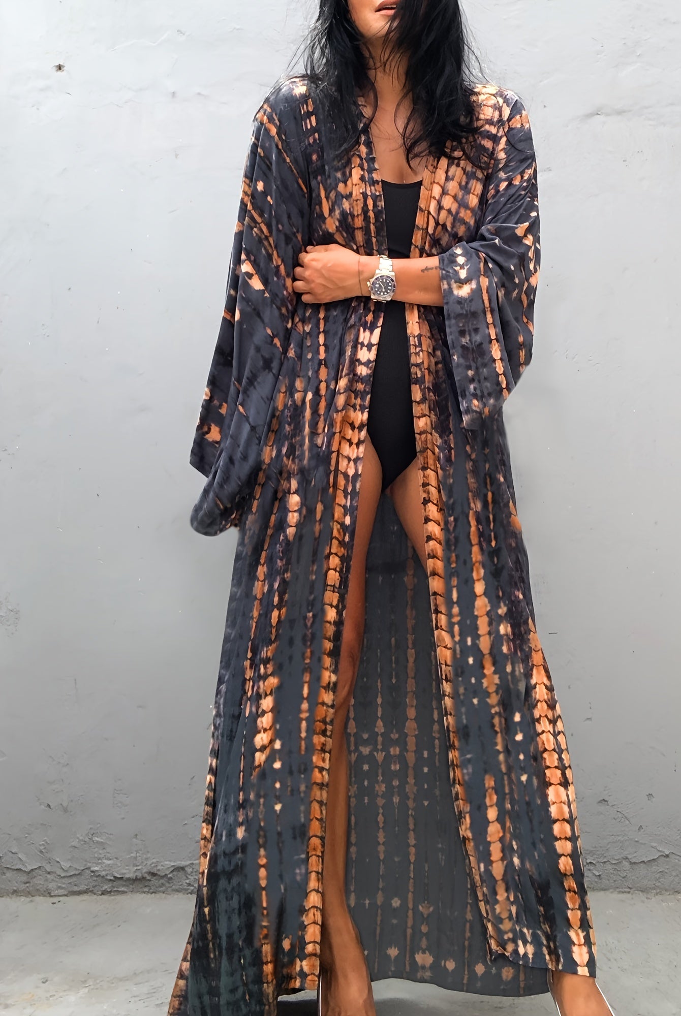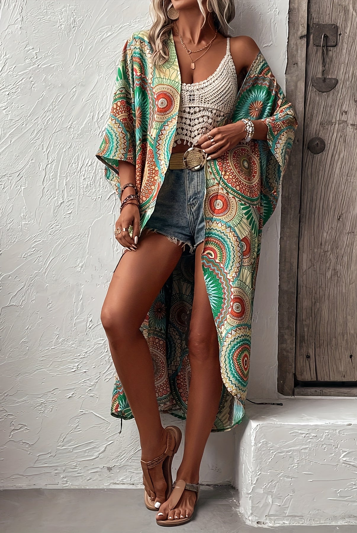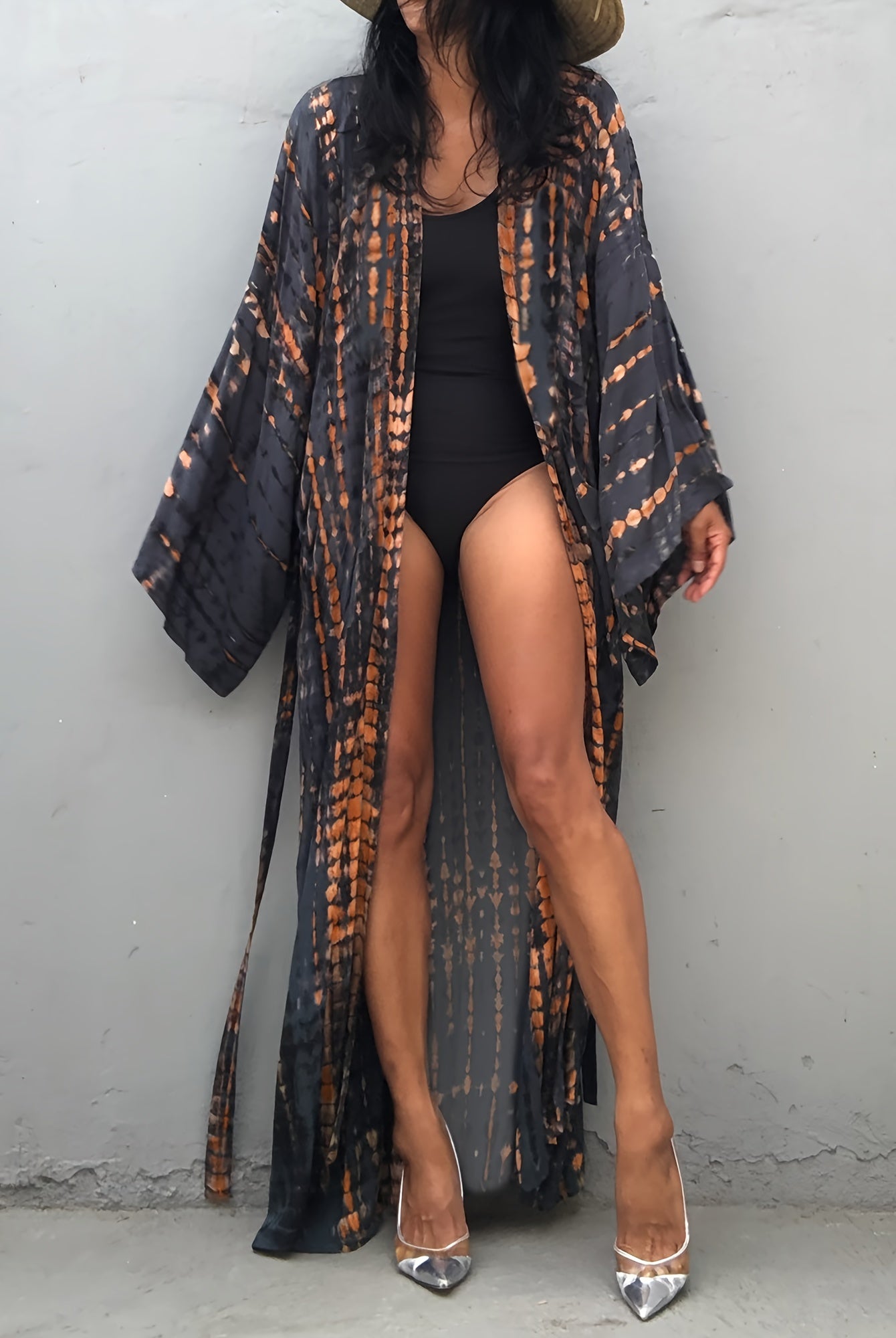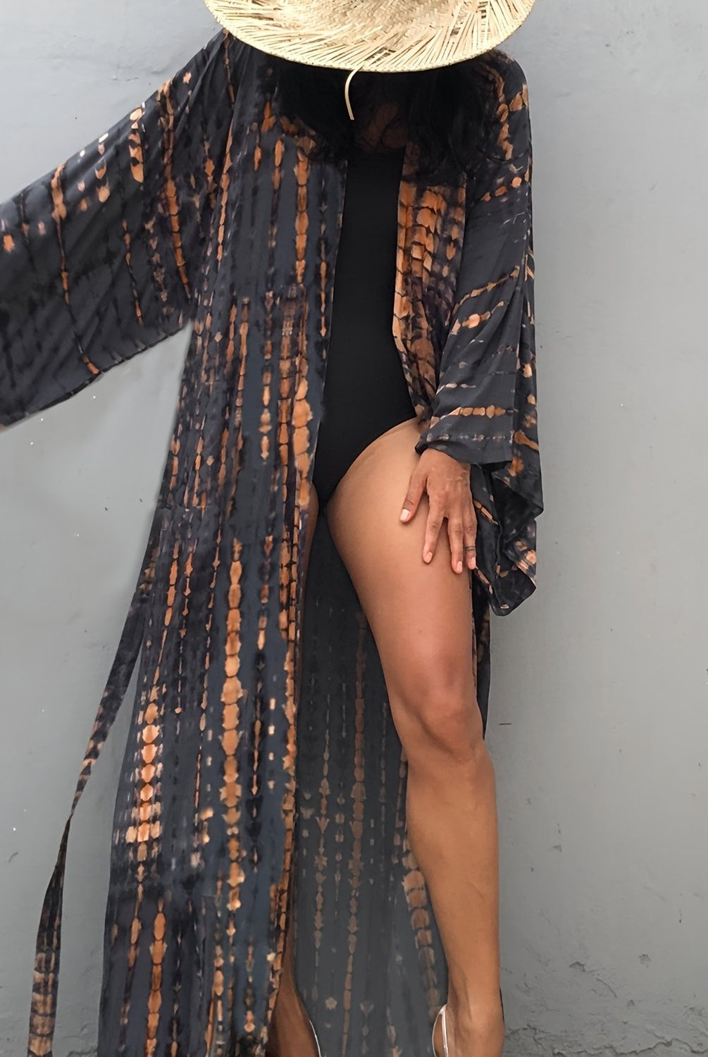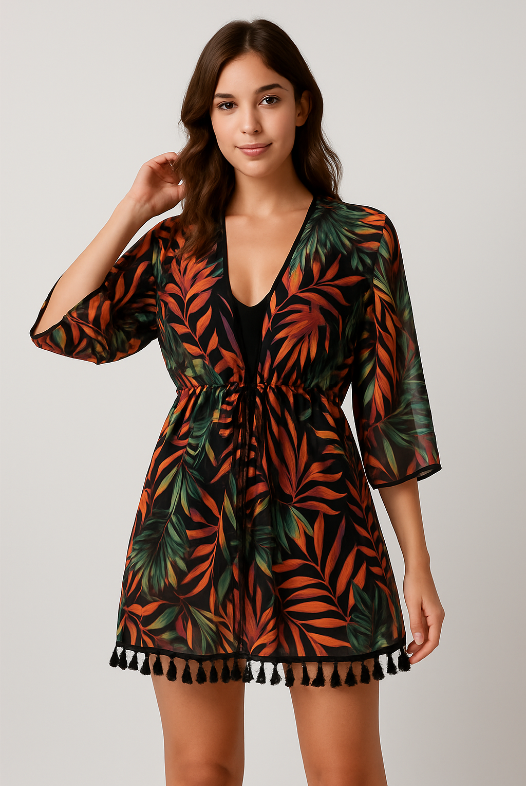 Si vous aimez les kimonos à motifs — floraux, ethniques ou tropicaux — l’idéal est de les porter avec un maillot de bain uni pour éviter l’effet surcharge. Les tons sobres comme le noir, le kaki ou le beige forment une belle base neutre et mettent en avant les couleurs du kimono.