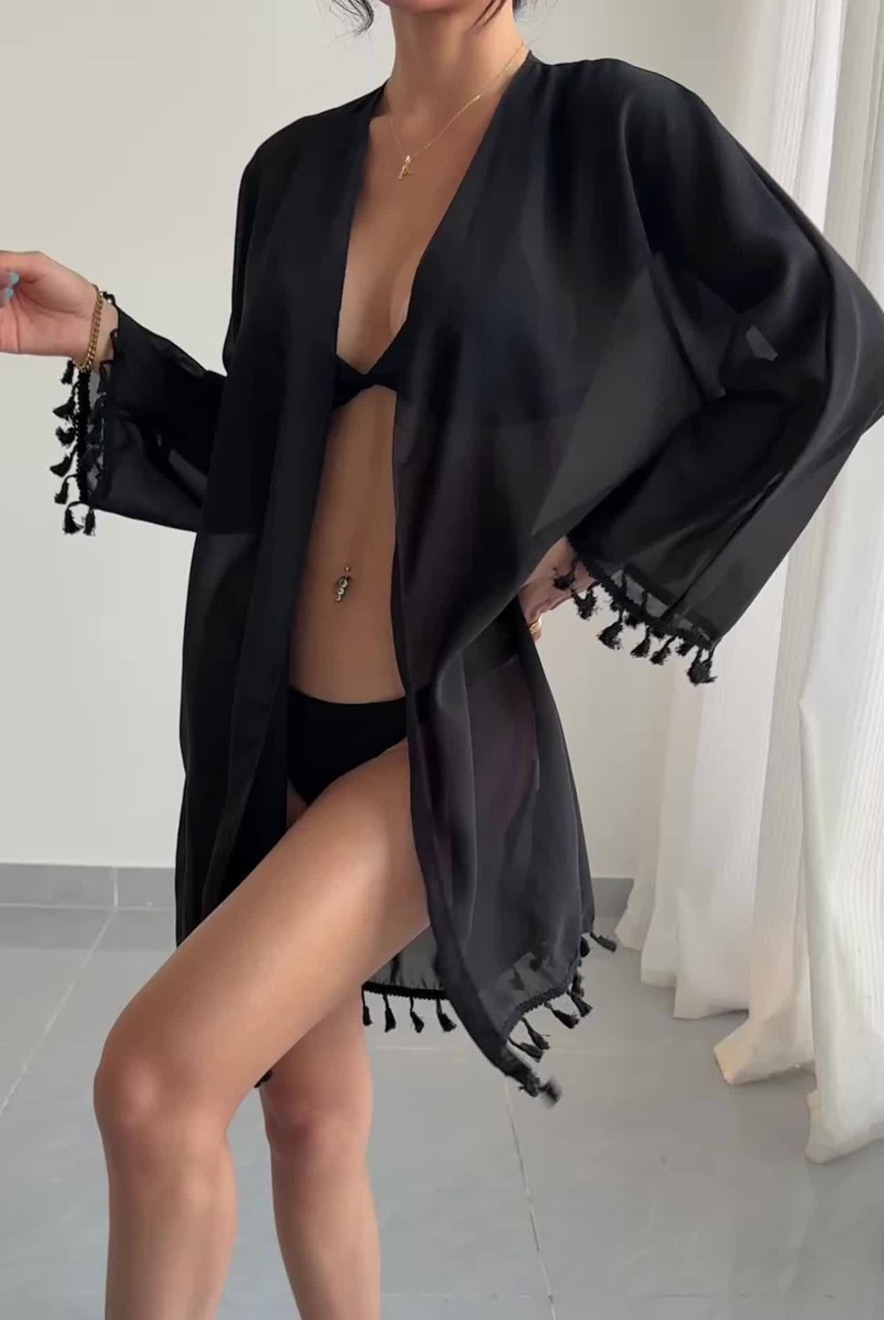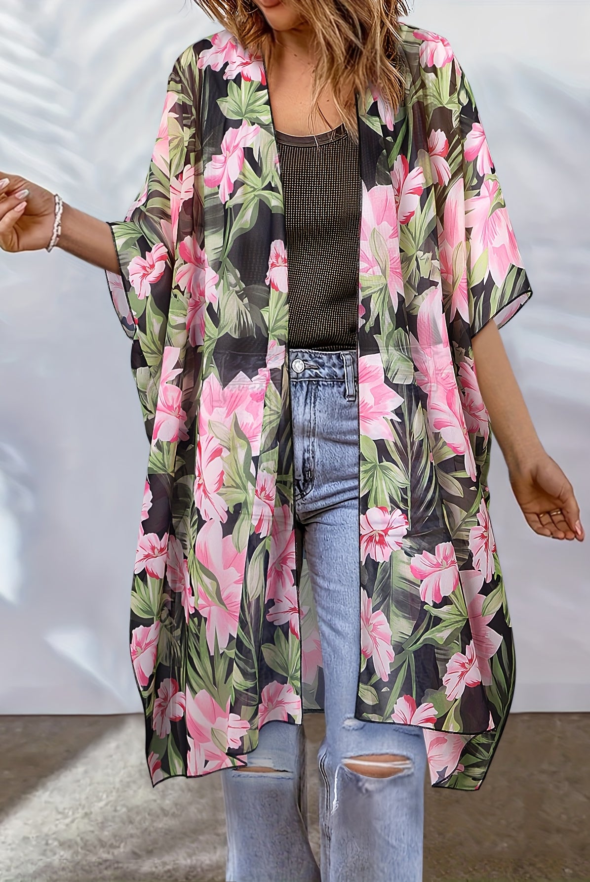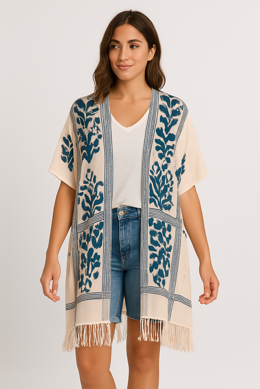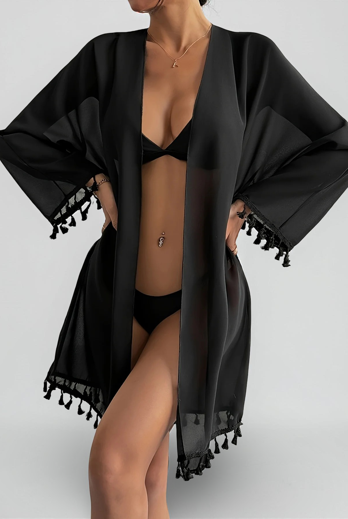 Si vous aimez les kimonos à motifs — floraux, ethniques ou tropicaux — l’idéal est de les porter avec un maillot de bain uni pour éviter l’effet surcharge. Les tons sobres comme le noir, le kaki ou le beige forment une belle base neutre et mettent en avant les couleurs du kimono.