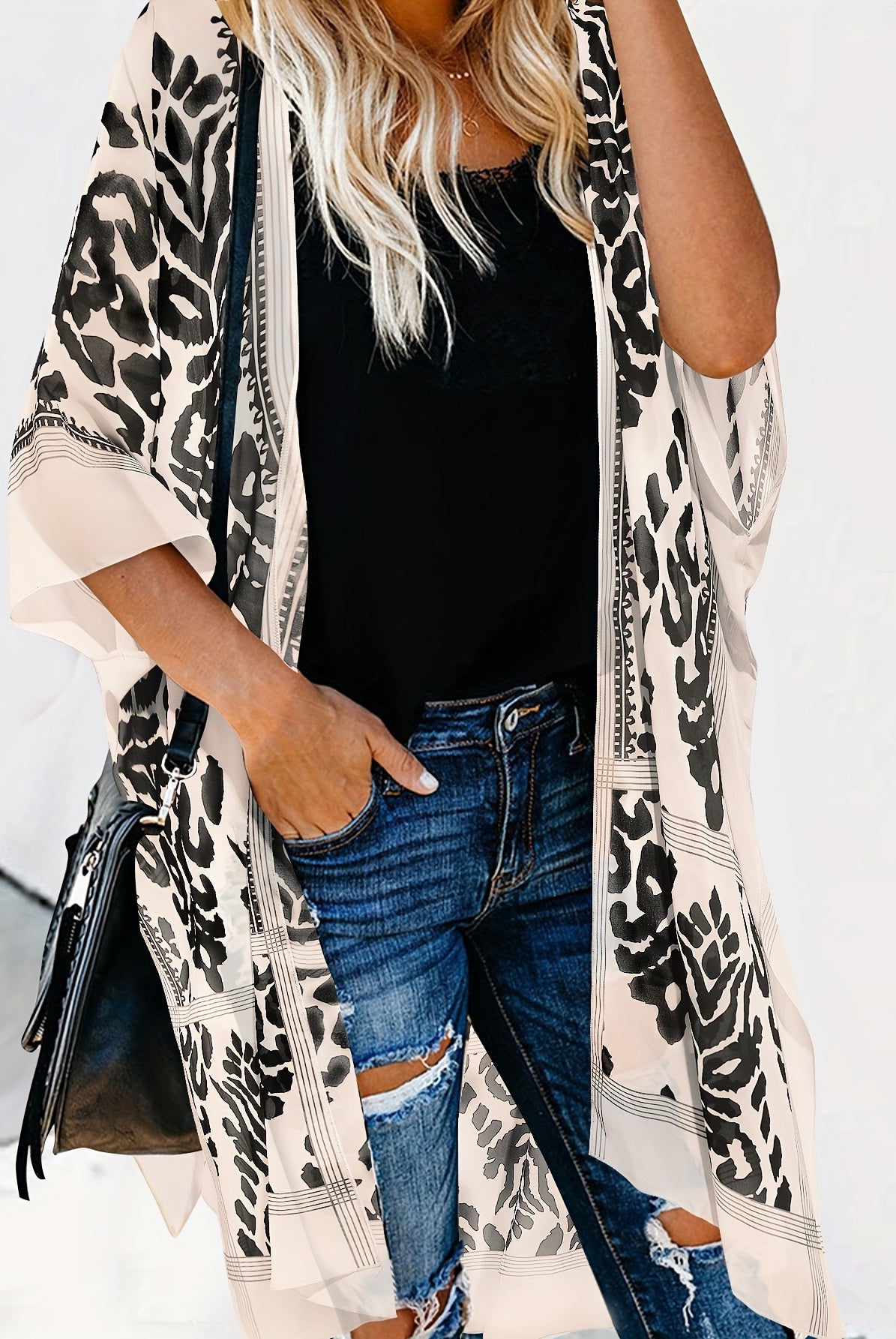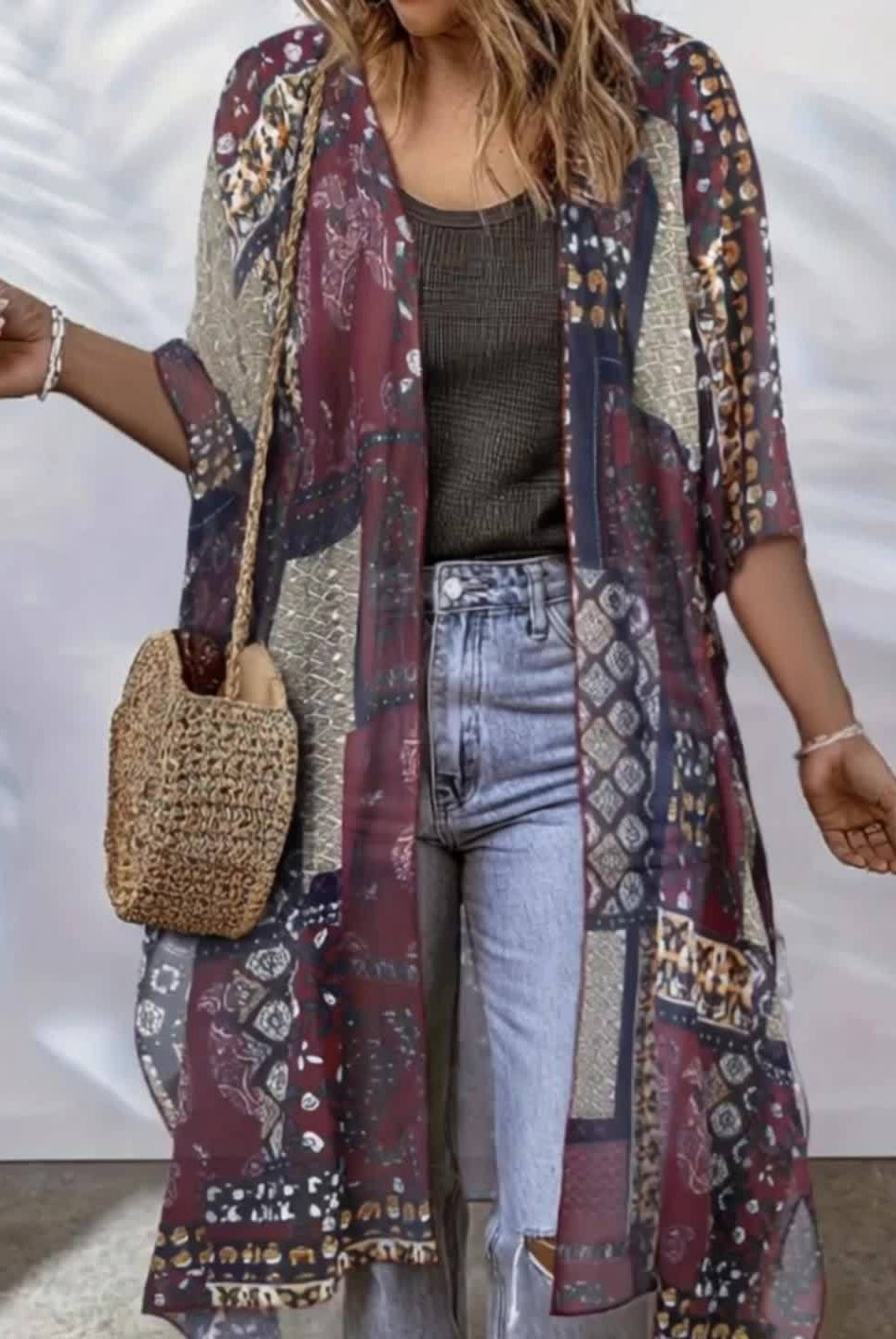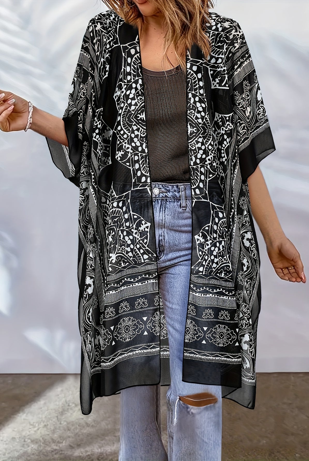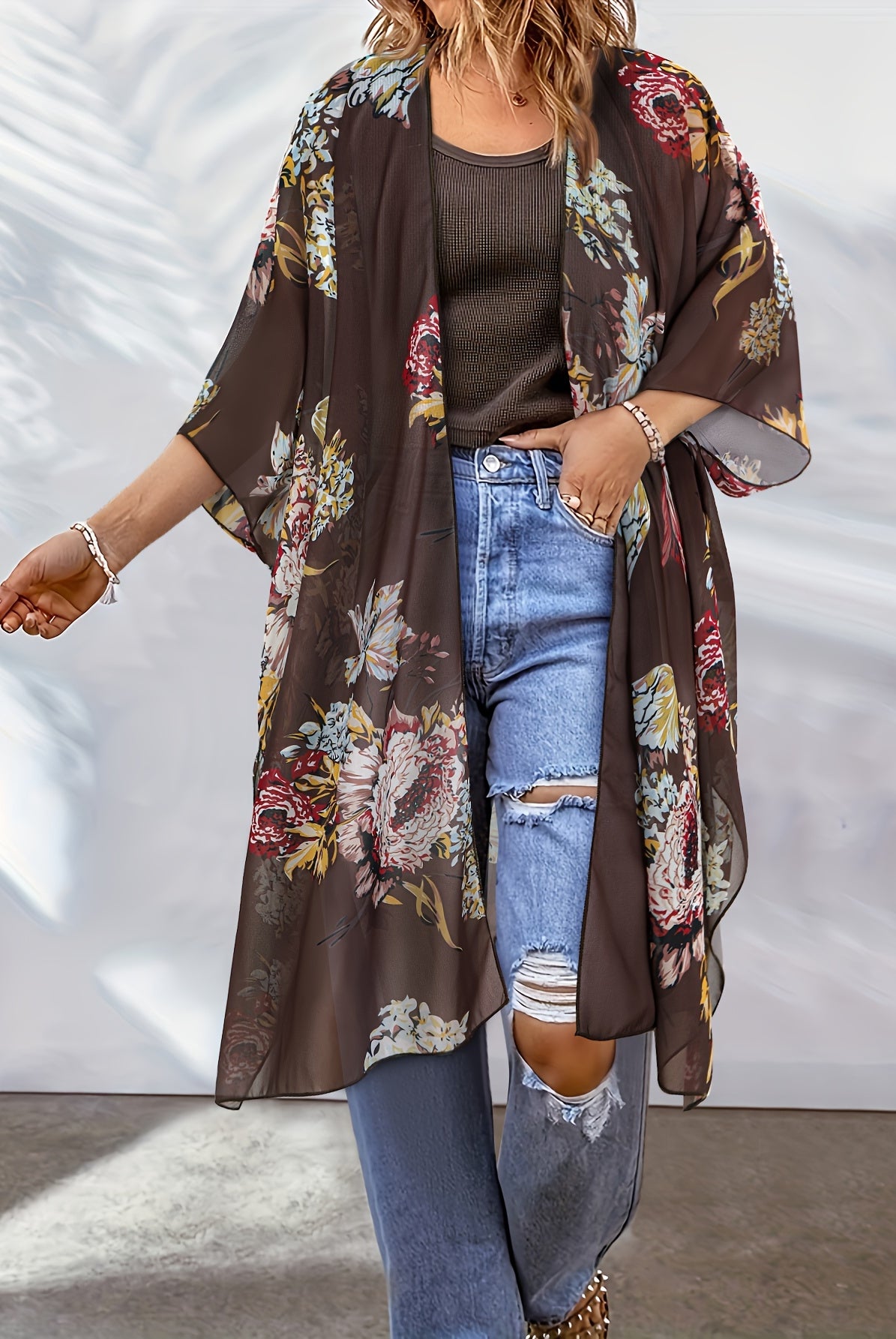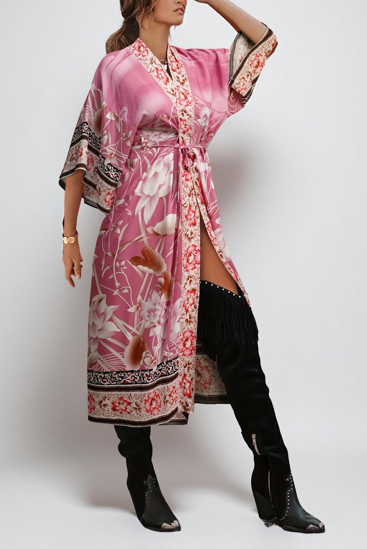 Si vous aimez les kimonos à motifs — floraux, ethniques ou tropicaux — l’idéal est de les porter avec un maillot de bain uni pour éviter l’effet surcharge. Les tons sobres comme le noir, le kaki ou le beige forment une belle base neutre et mettent en avant les couleurs du kimono.