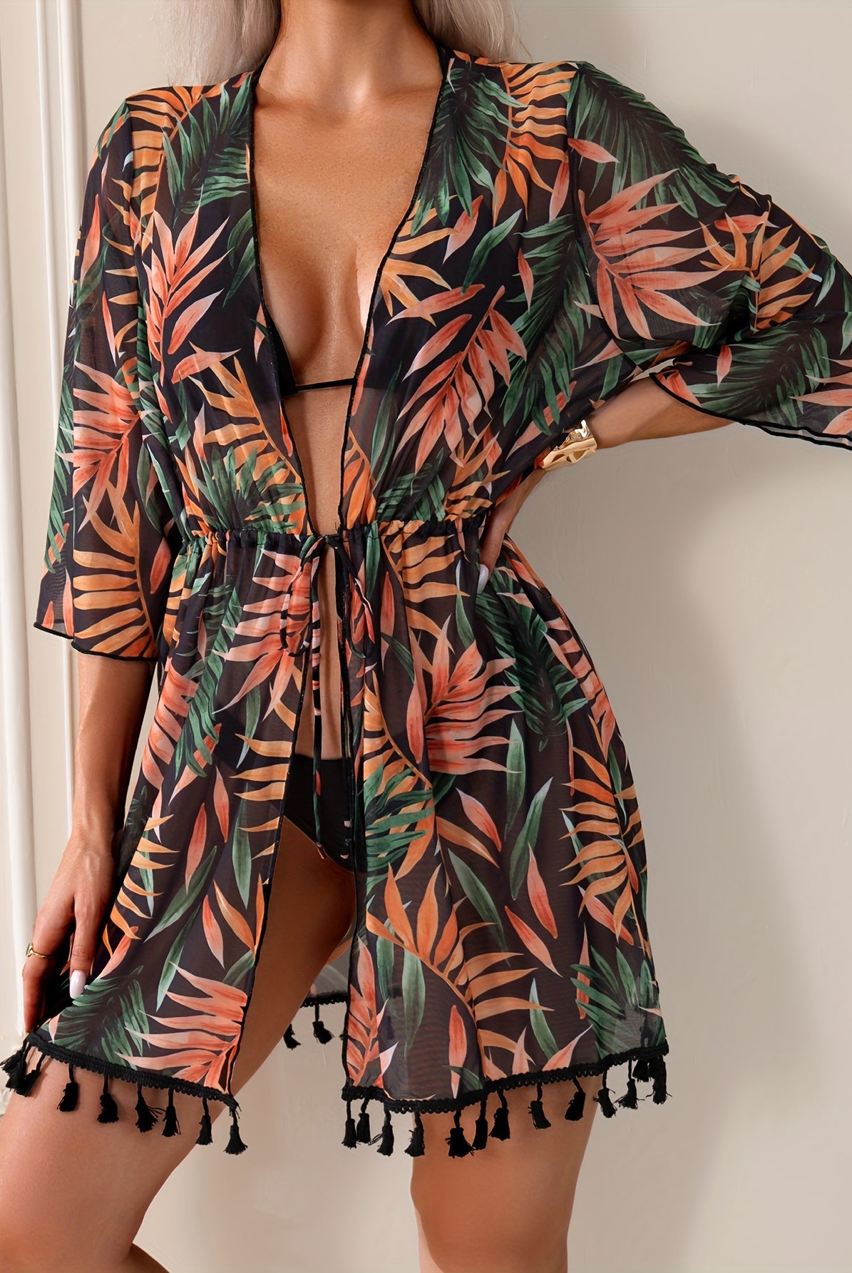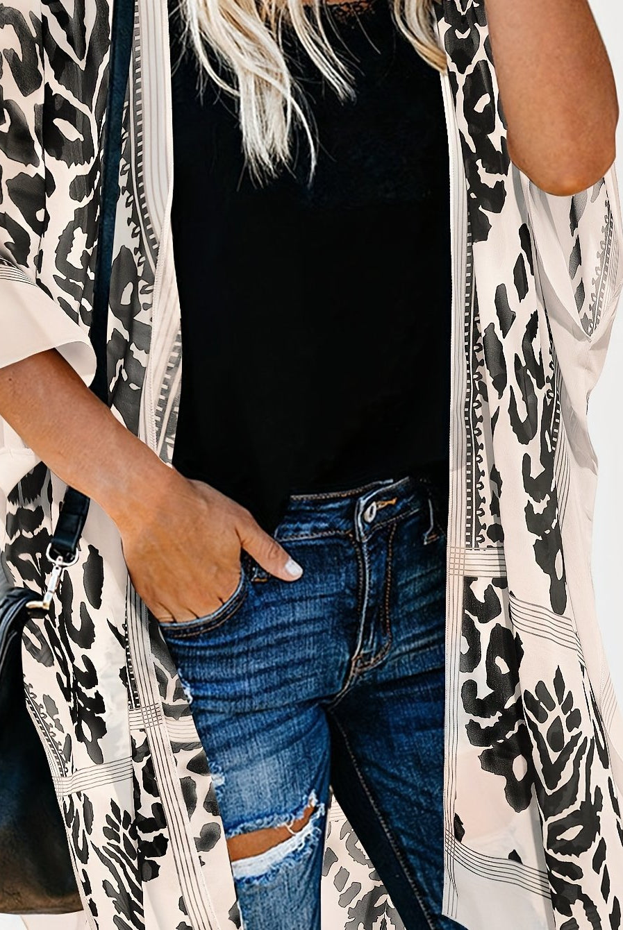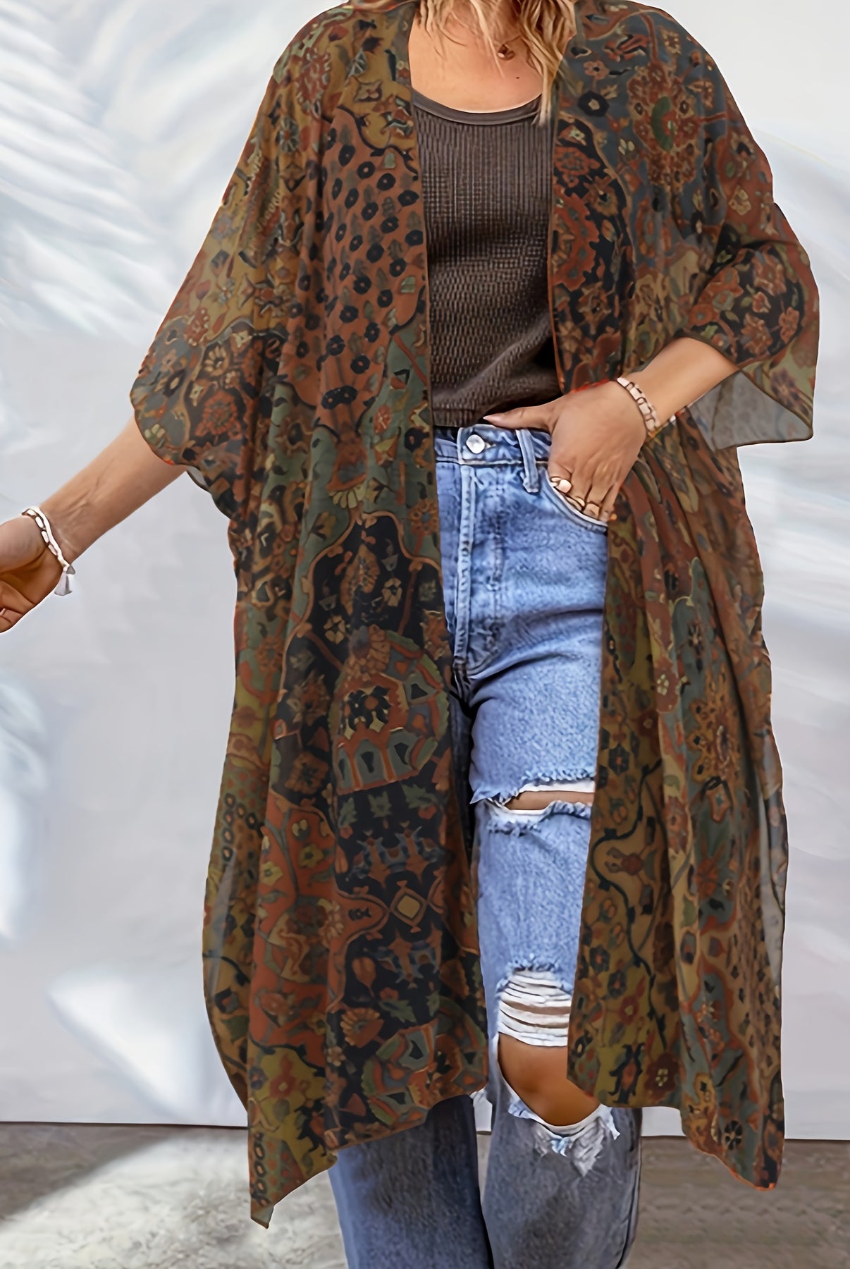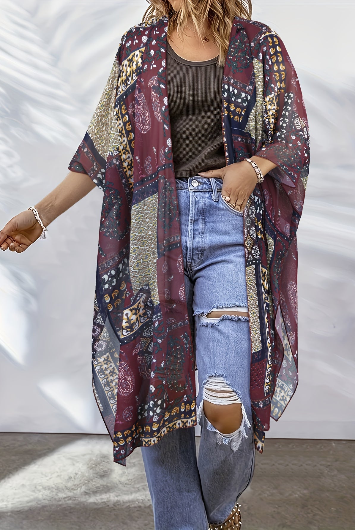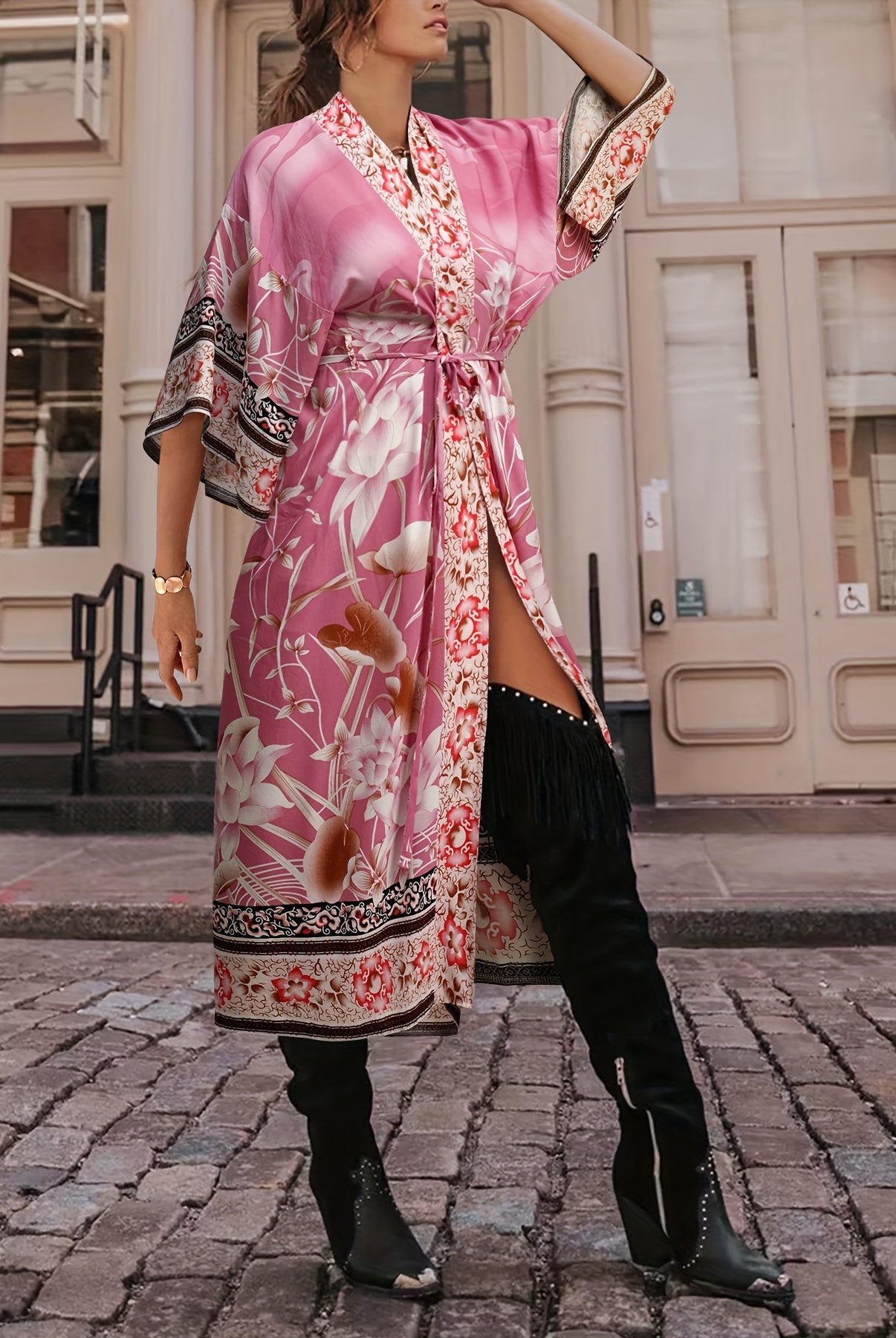 Si vous aimez les kimonos à motifs — floraux, ethniques ou tropicaux — l’idéal est de les porter avec un maillot de bain uni pour éviter l’effet surcharge. Les tons sobres comme le noir, le kaki ou le beige forment une belle base neutre et mettent en avant les couleurs du kimono.