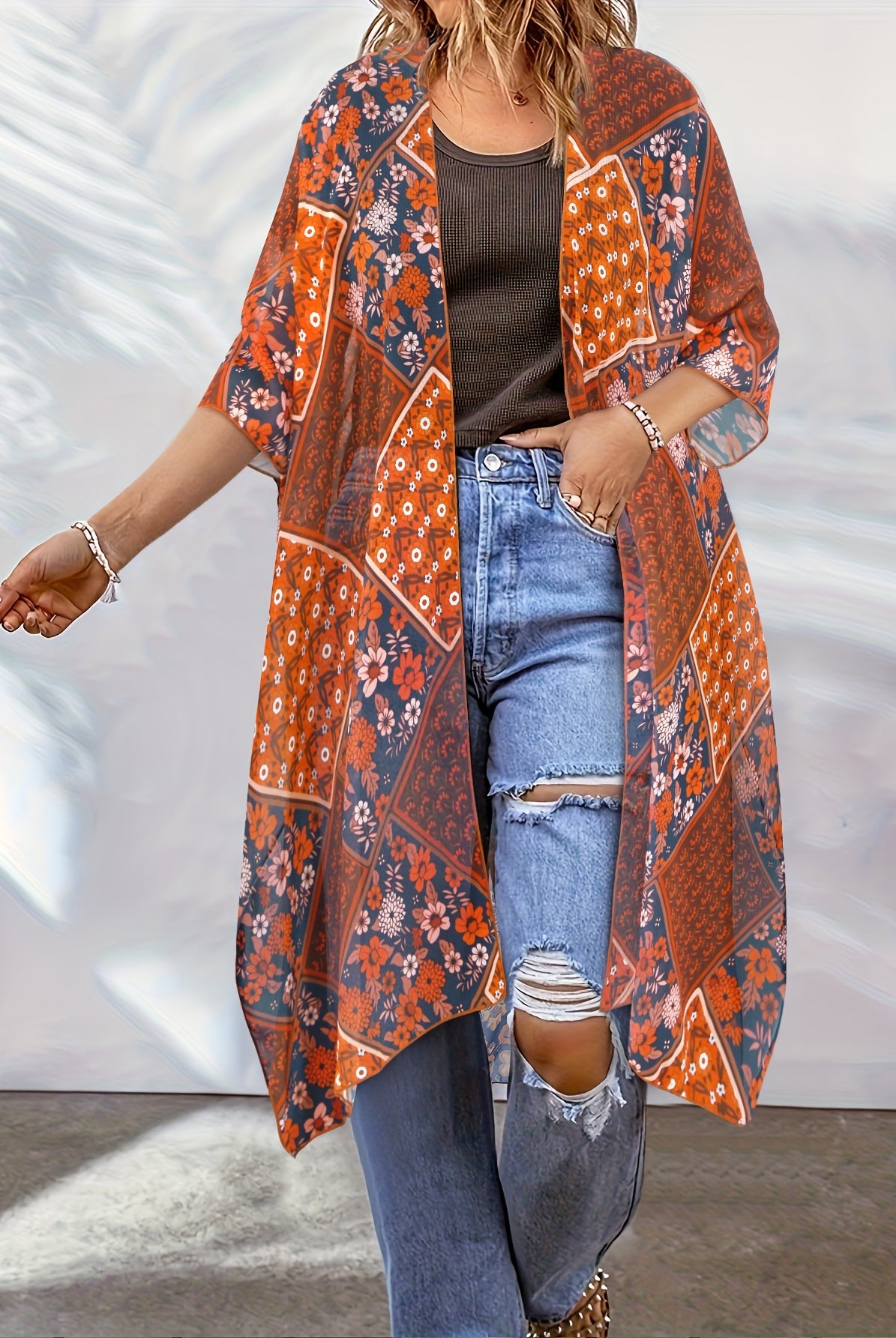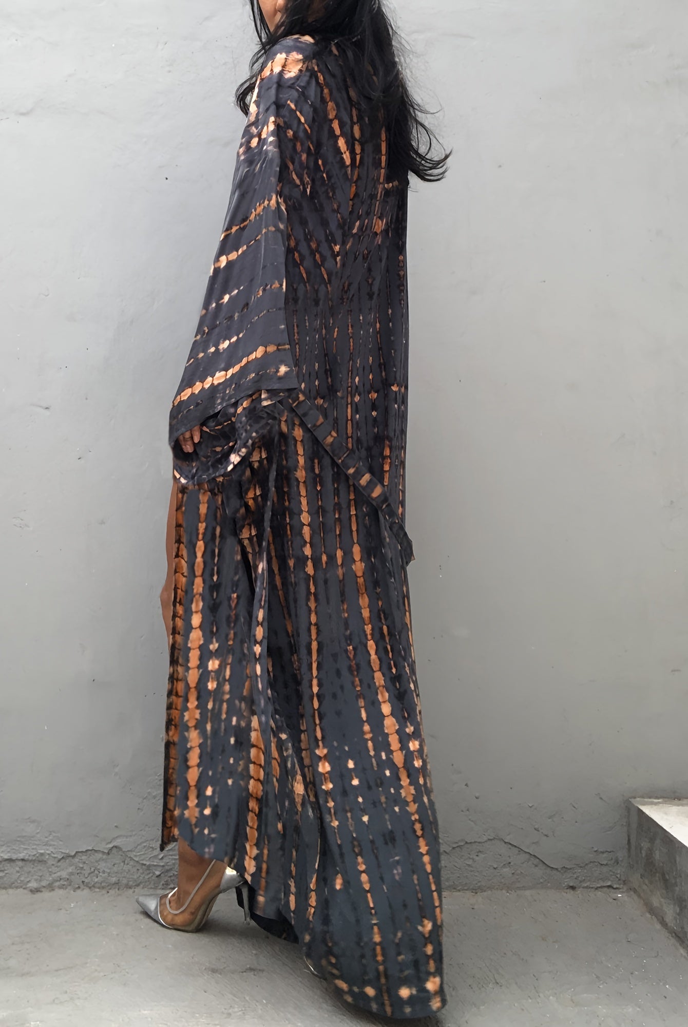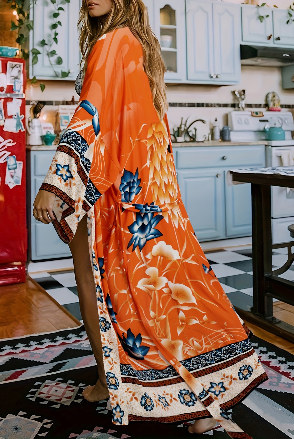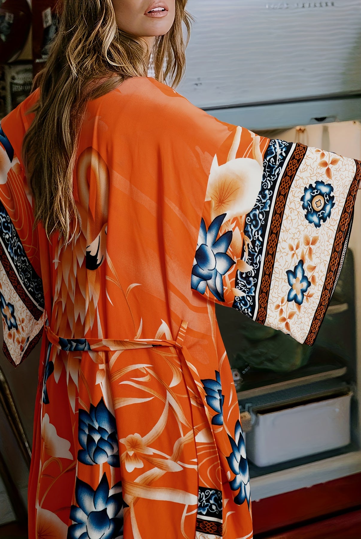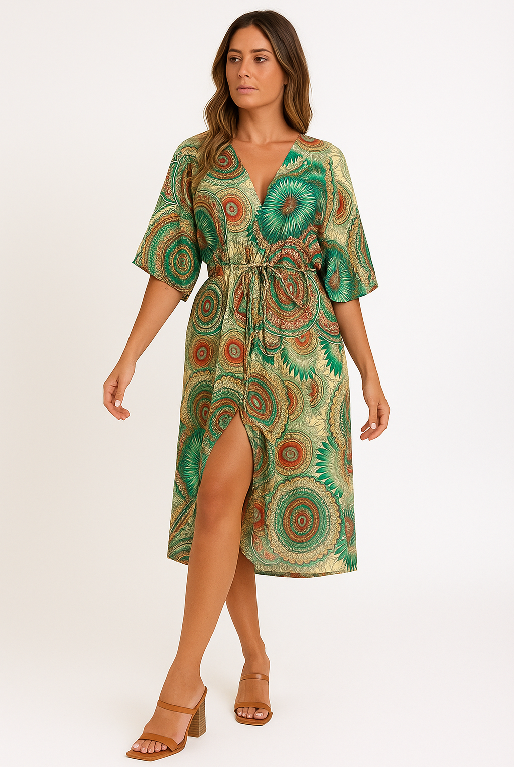 Si vous aimez les kimonos à motifs — floraux, ethniques ou tropicaux — l’idéal est de les porter avec un maillot de bain uni pour éviter l’effet surcharge. Les tons sobres comme le noir, le kaki ou le beige forment une belle base neutre et mettent en avant les couleurs du kimono.