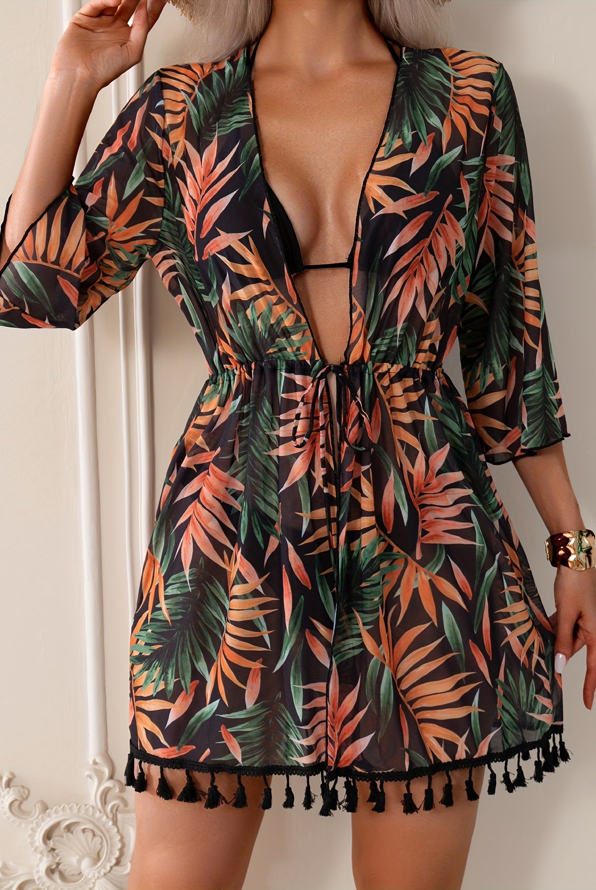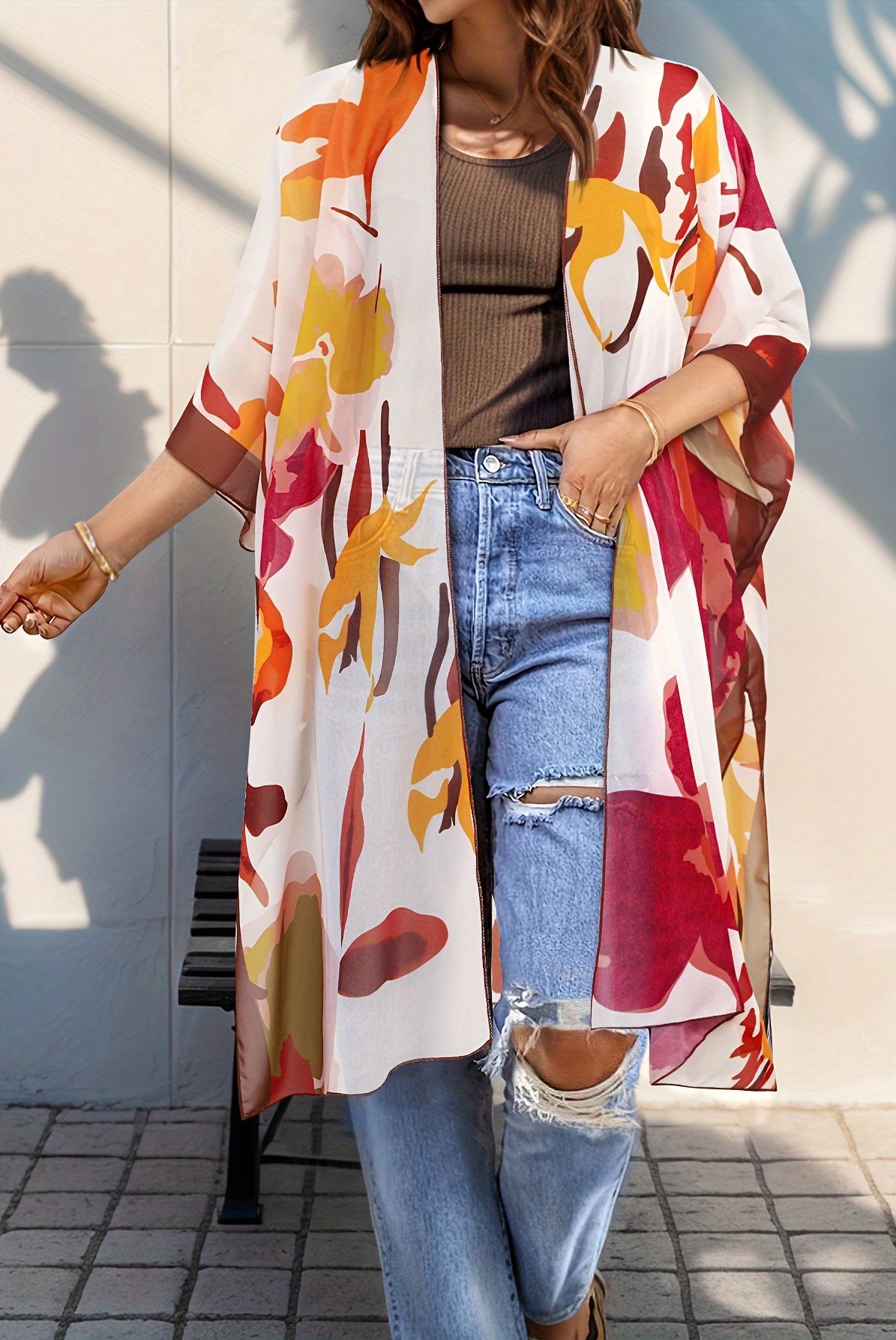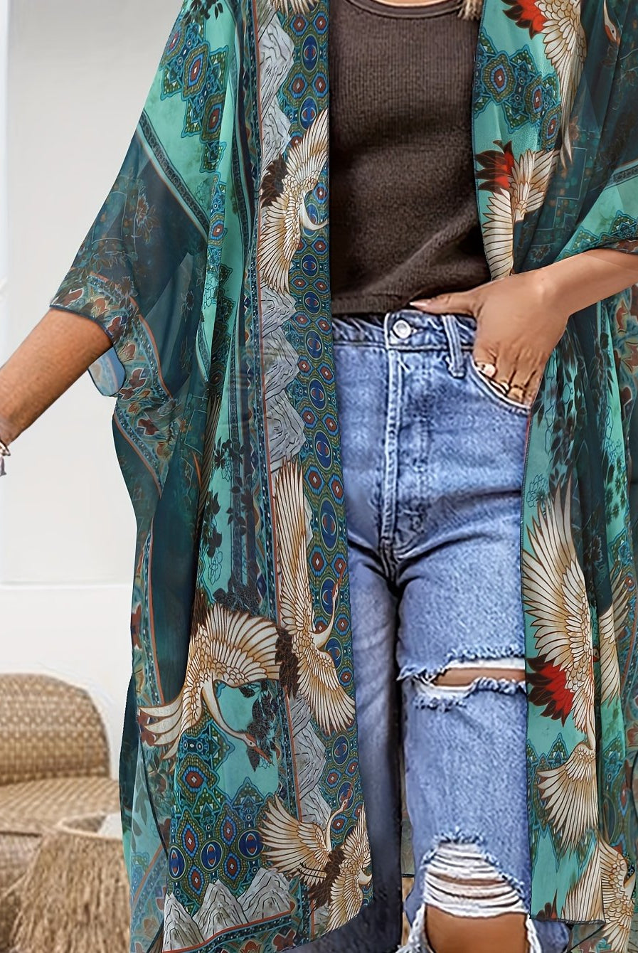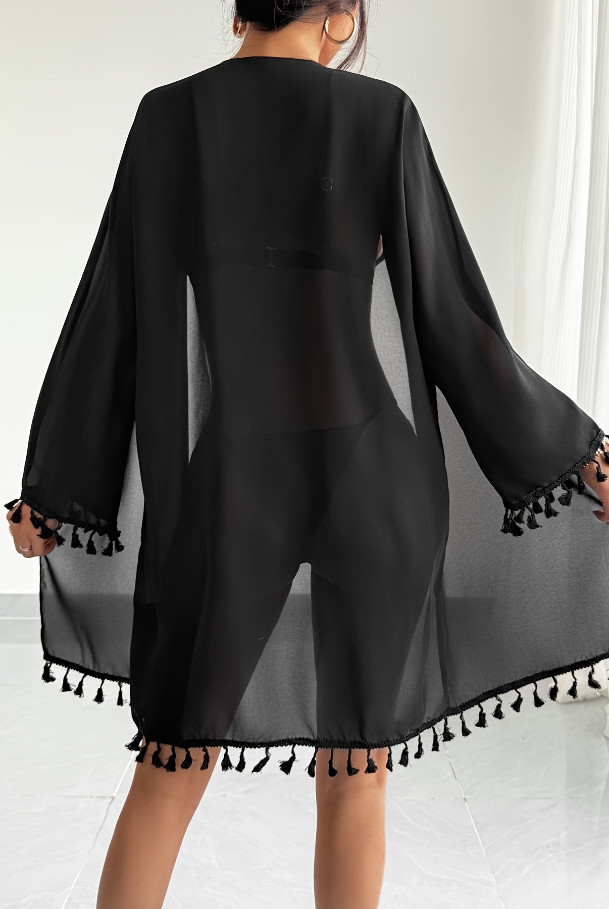 Si vous aimez les kimonos à motifs — floraux, ethniques ou tropicaux — l’idéal est de les porter avec un maillot de bain uni pour éviter l’effet surcharge. Les tons sobres comme le noir, le kaki ou le beige forment une belle base neutre et mettent en avant les couleurs du kimono.