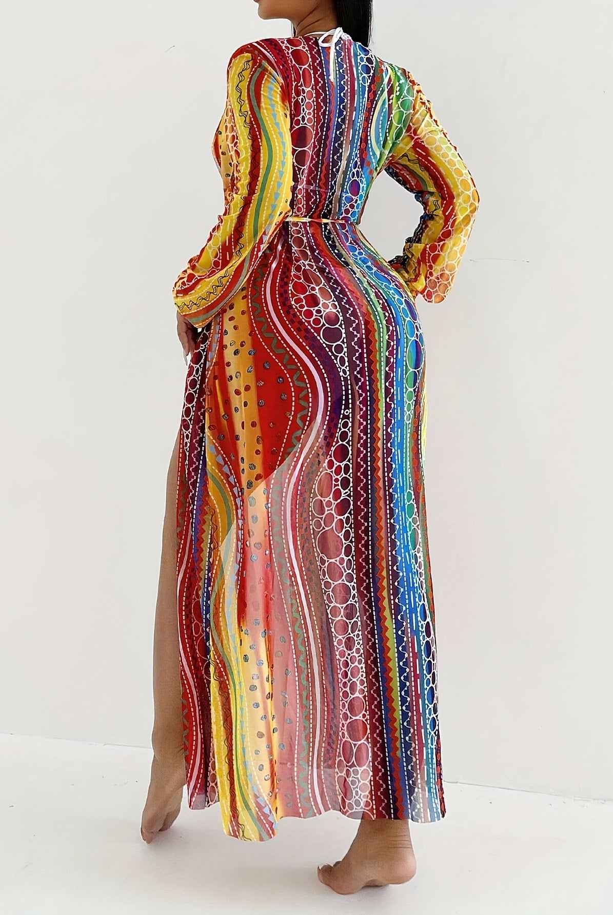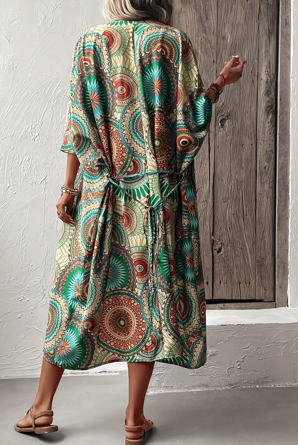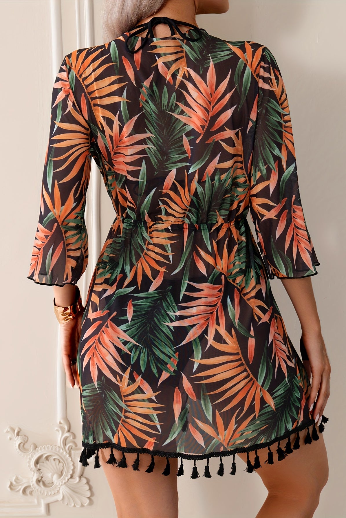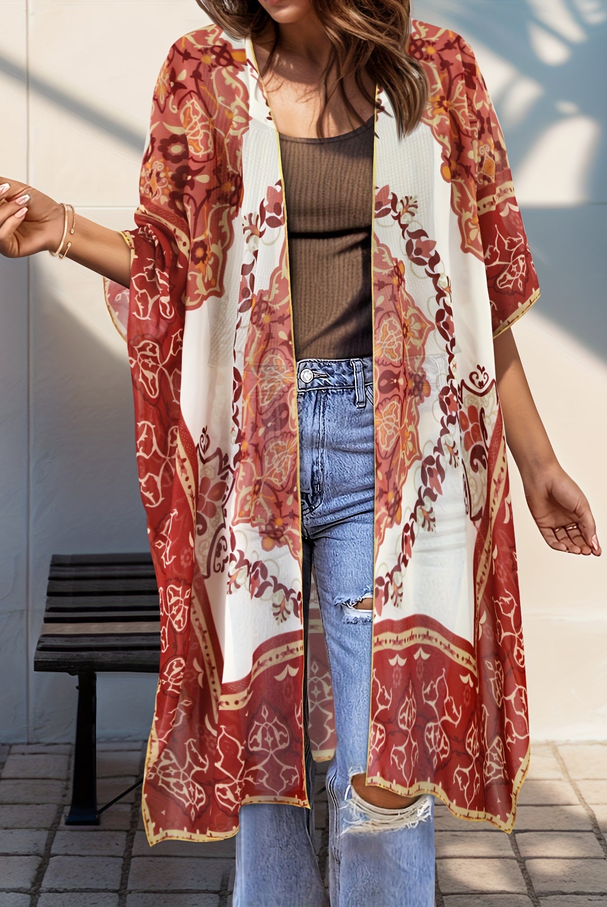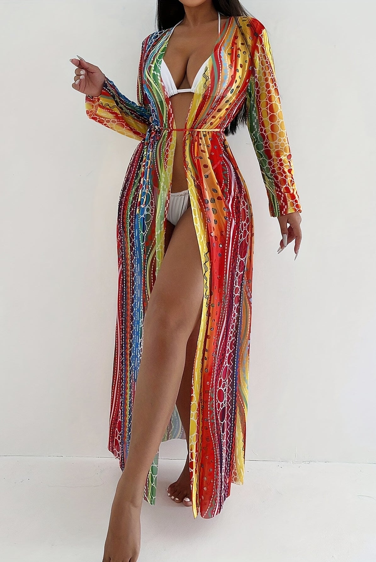 Si vous aimez les kimonos à motifs — floraux, ethniques ou tropicaux — l’idéal est de les porter avec un maillot de bain uni pour éviter l’effet surcharge. Les tons sobres comme le noir, le kaki ou le beige forment une belle base neutre et mettent en avant les couleurs du kimono.