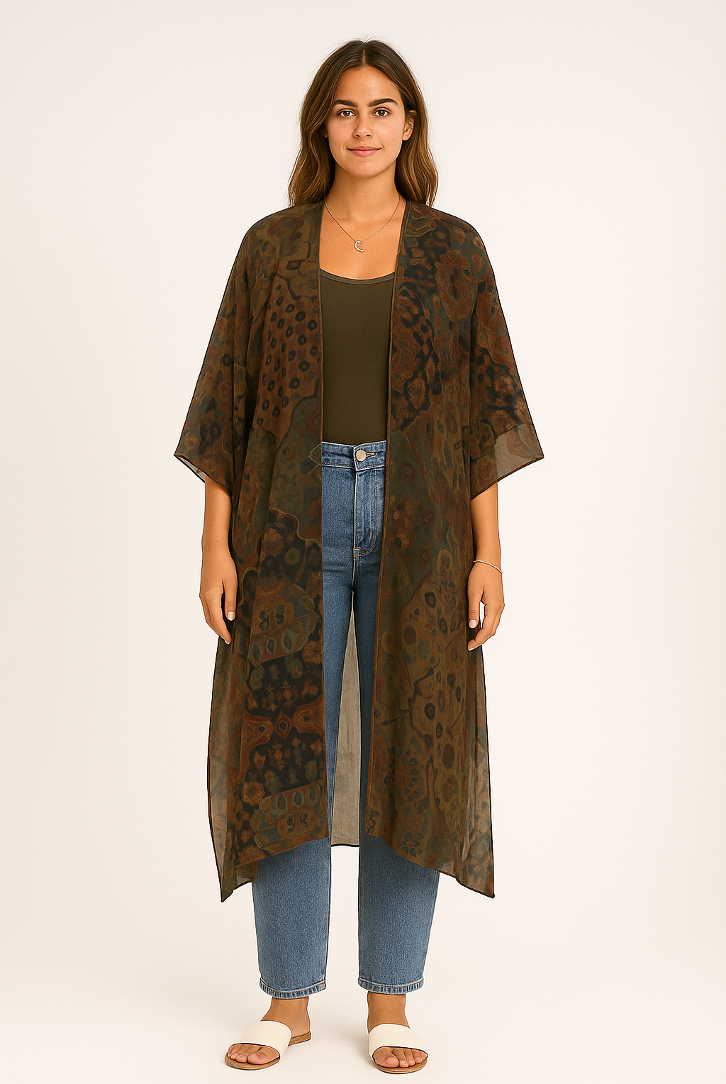 Les morphologies plus généreuses seront mises en valeur par des kimonos mi-longs aux manches trois-quarts. Évitez les coupes trop rigides, et misez sur des tissus souples qui ne collent pas au corps. Les motifs discrets ou les tons unis apportent de l’élégance sans surcharge visuelle.