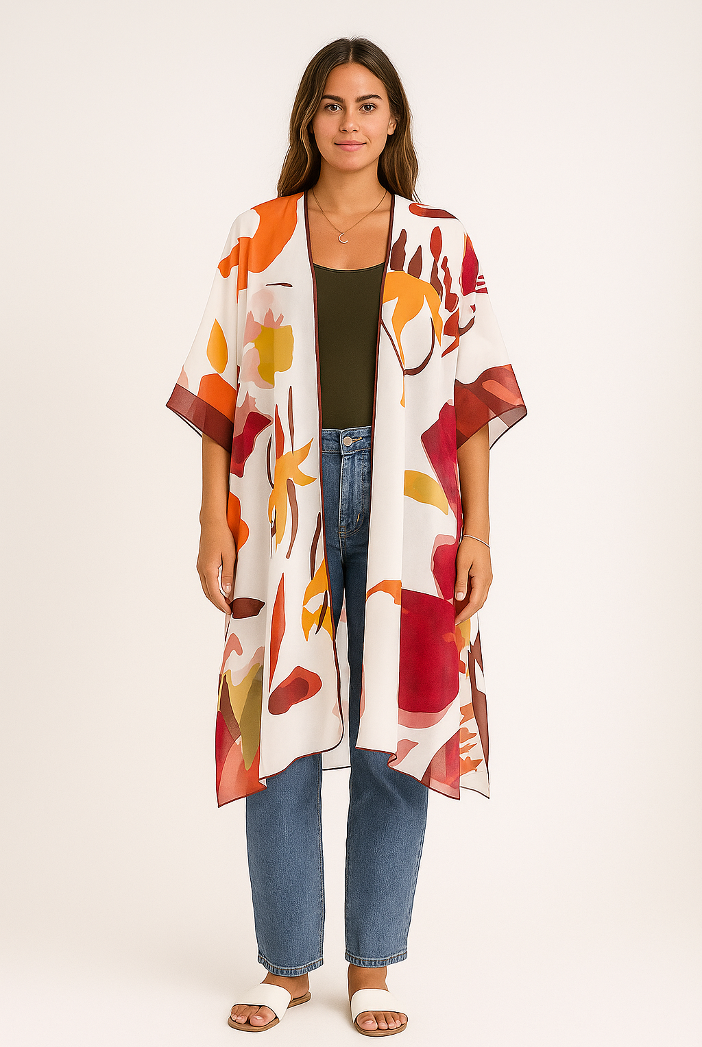 Les femmes grandes et élancées peuvent facilement adopter le kimono long, fluide et fendu. Il accompagne les mouvements et structure la silhouette sans la tasser. Privilégiez les modèles à imprimés verticaux ou à ceinture pour accentuer la taille, tout en gardant un effet aérien.