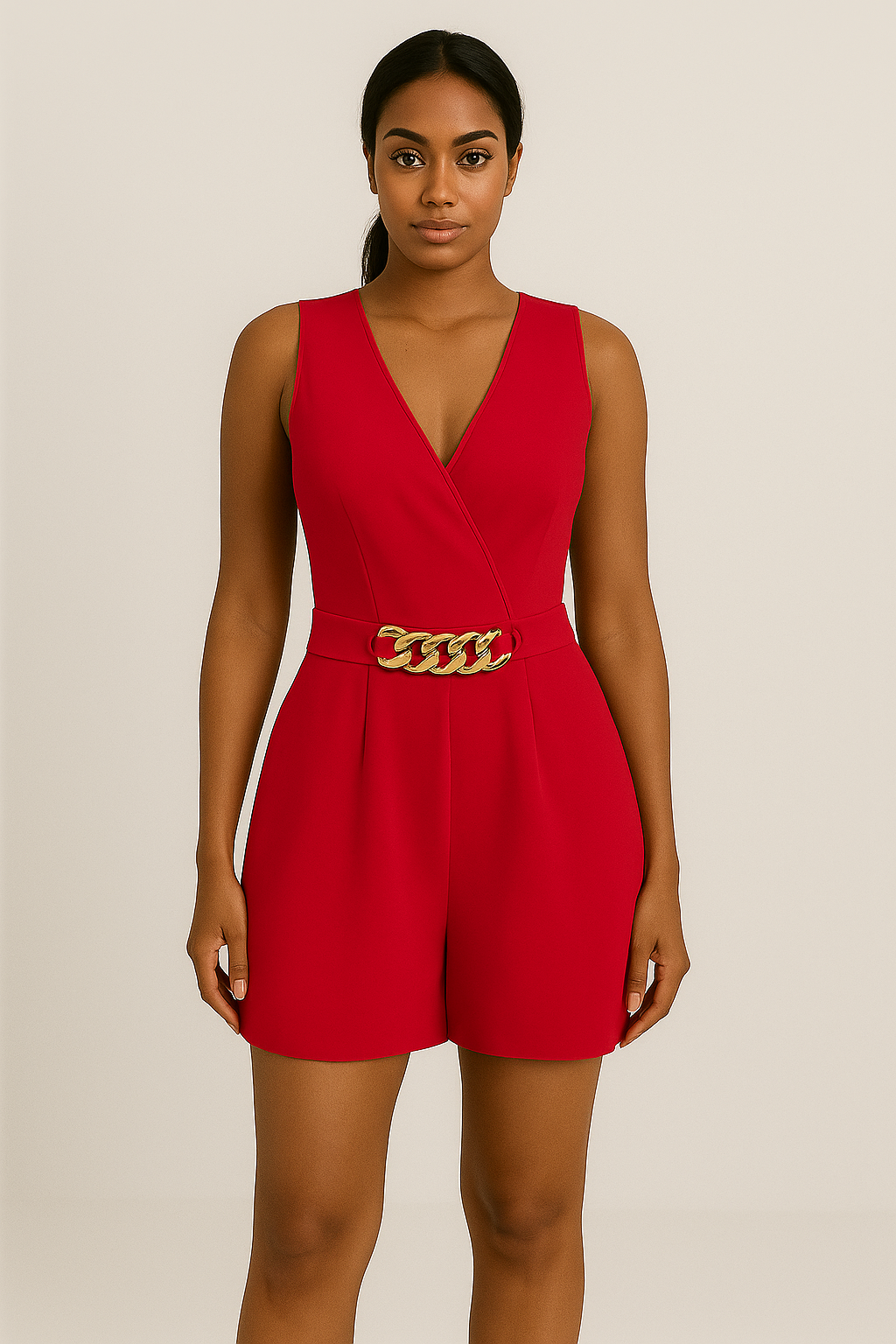 Ce combishort portefeuille sans manches se distingue par son décolleté croisé façon cache-cœur, sa taille haute structurée et ses plis au niveau des cuisses qui ajoutent de la fluidité à la coupe. La ceinture avec maillons dorés donne un accent sophistiqué au look.