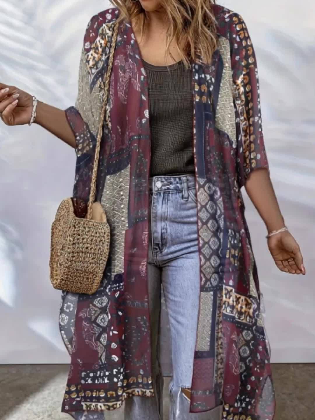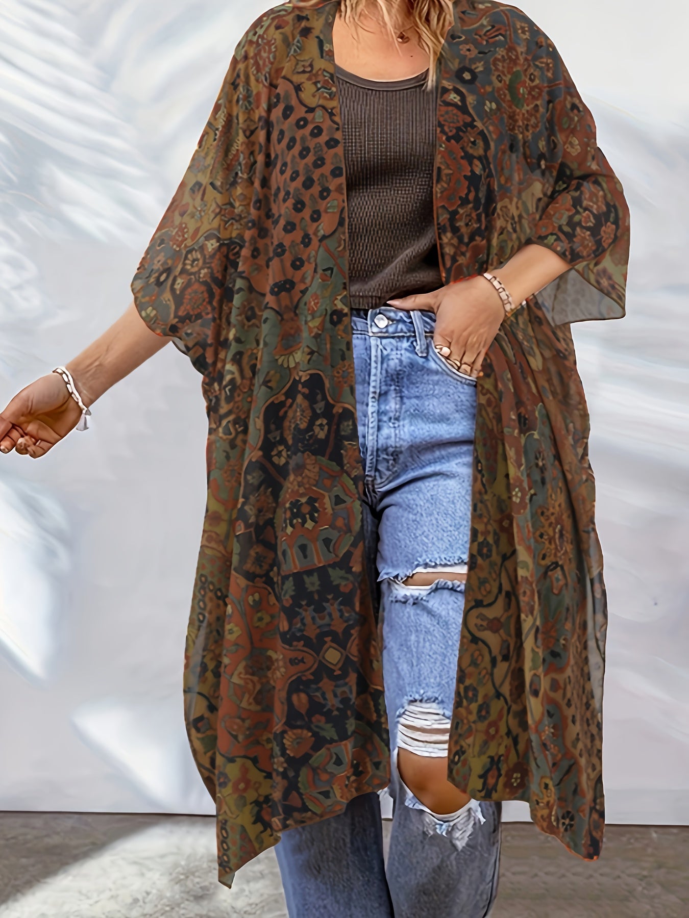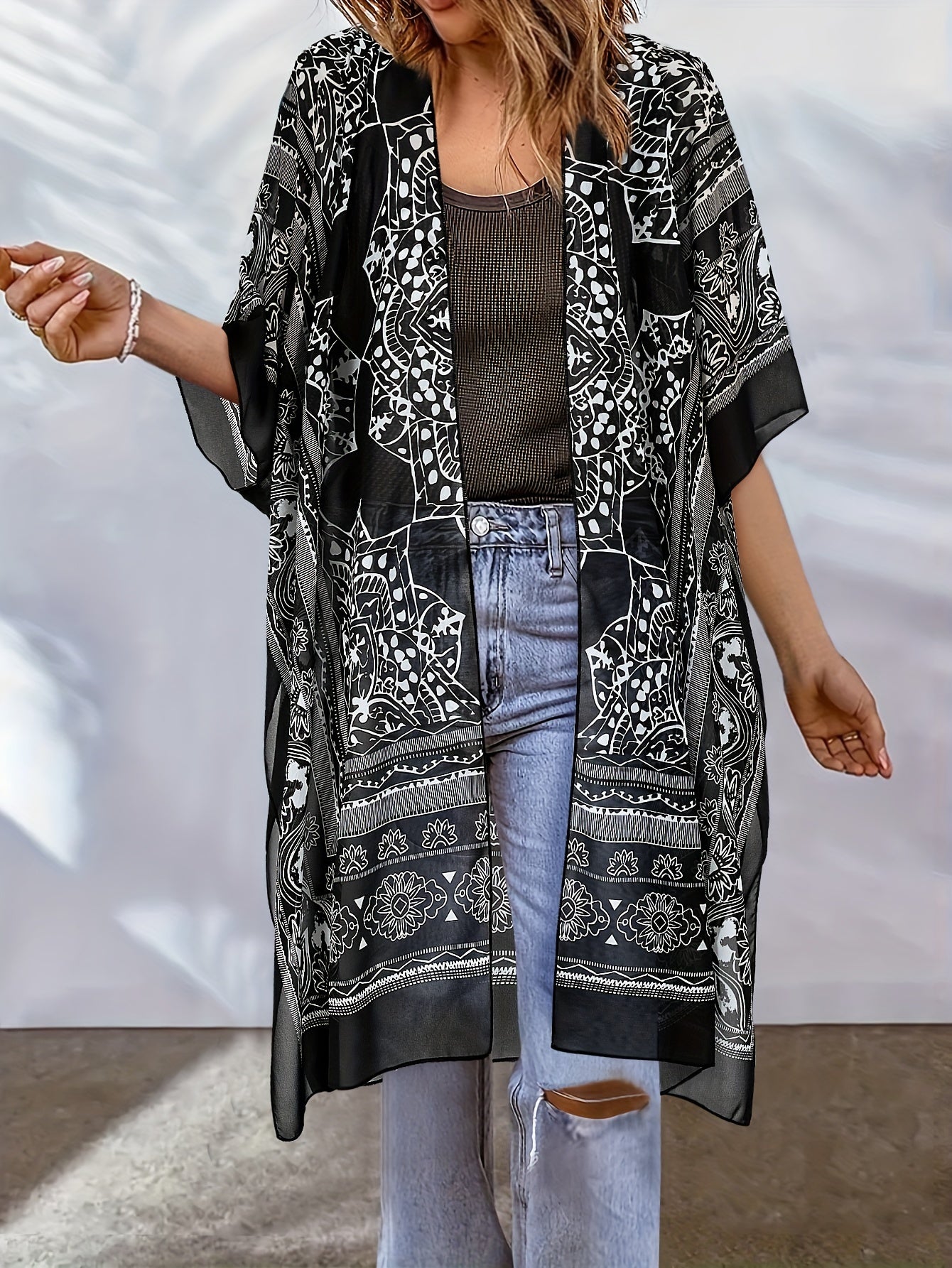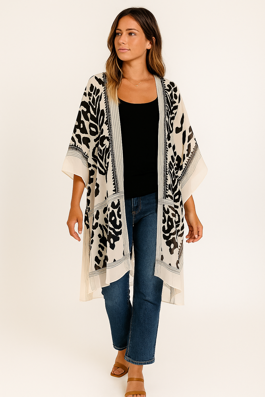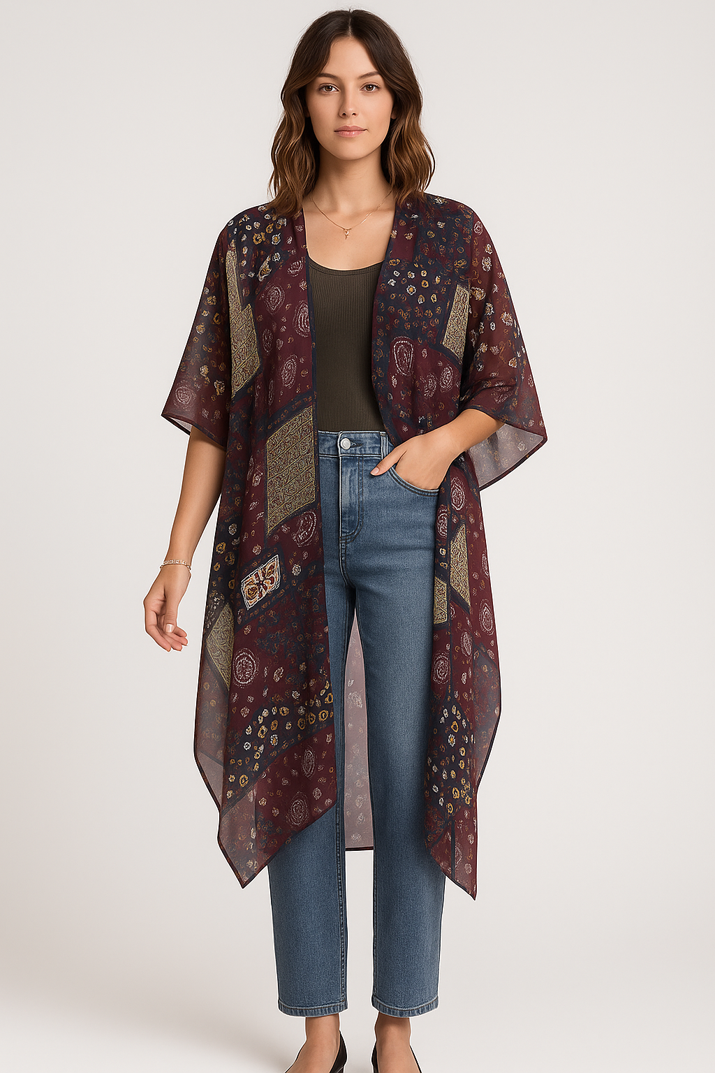Ajoutez une touche de caractère à vos tenues avec ce kimono fluide à imprimé bohème. Confortable et ultra-stylé, il s’adapte aussi bien à vos journées détente qu’à vos looks urbains.