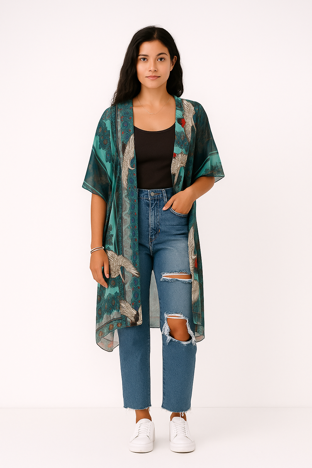 Facile à associer avec des baskets, des sandales ou des bottines, ce kimono fluide est parfait pour les journées estivales ou les soirées fraîches. Il existe en plusieurs motifs et déclinaisons pour s’adapter à tous les goûts.