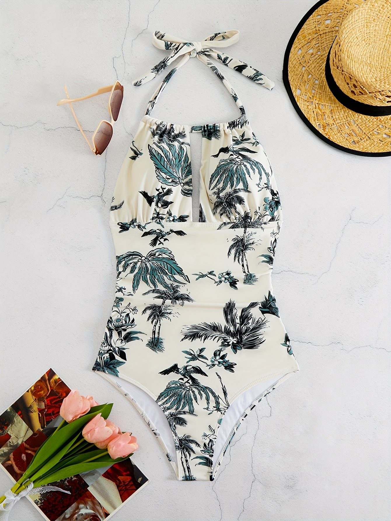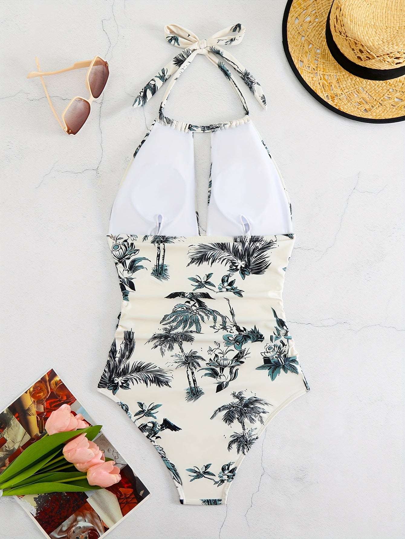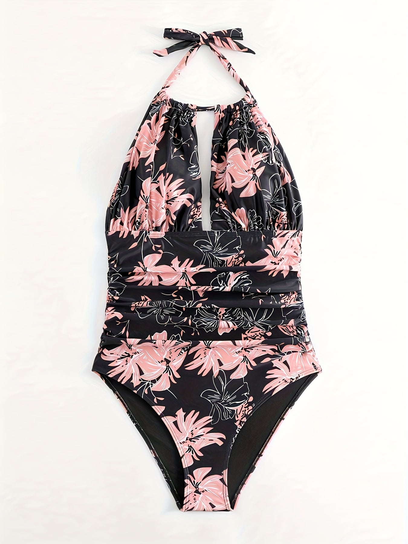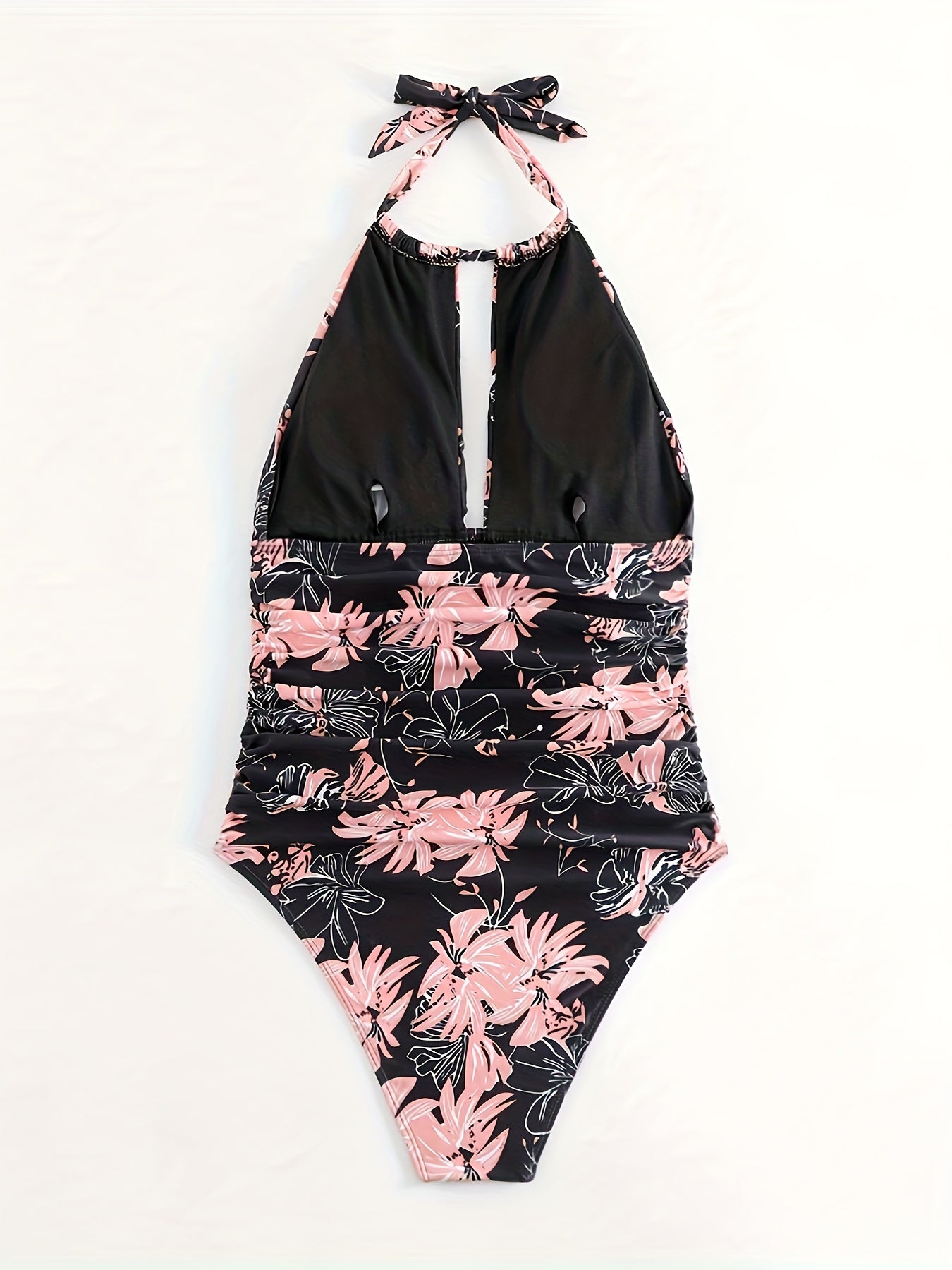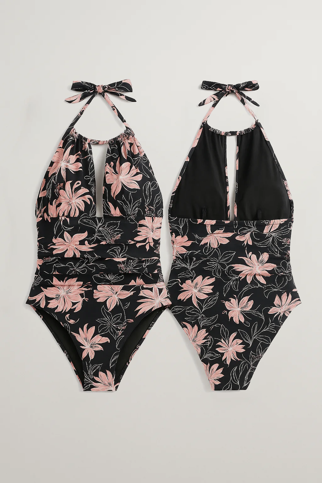 Maillot de bain 1 pièce fleuri femme avec col noué dos nu, imprimé floral élégant et effet gainant, parfait pour allier séduction et confort en vacances.