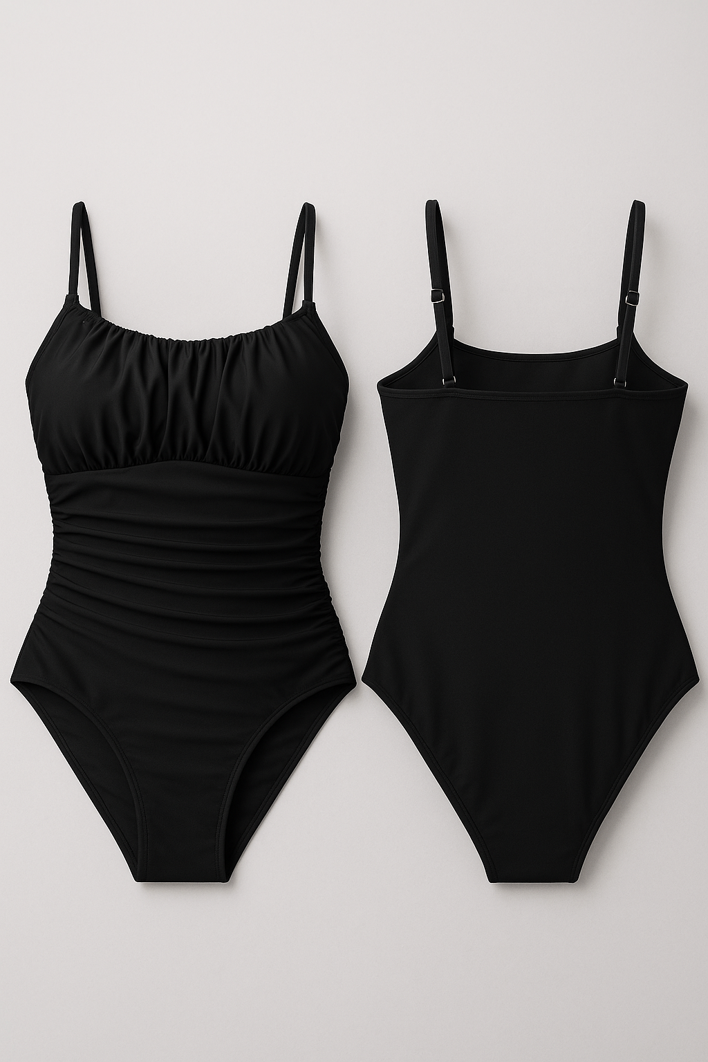 Ce modèle affine la silhouette avec un jeu de fronces élégantes sur le buste et le ventre. Le décolleté souple et les bretelles fines ajustables structurent la poitrine avec subtilité et maintien, sans compression. Sa matière douce épouse les formes avec fluidité.