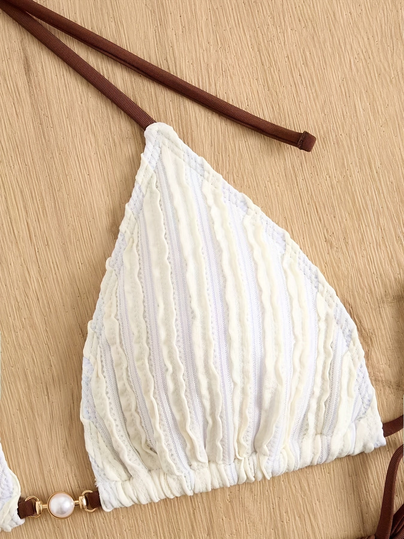 Le haut triangle ajustable est sublimé par une texture gaufrée en relief et une perle centrale dorée, signature délicate et féminine. Les lanières fines à nouer au cou et dans le dos assurent un maintien léger et modulable, pour une silhouette à la fois douce et équilibrée.