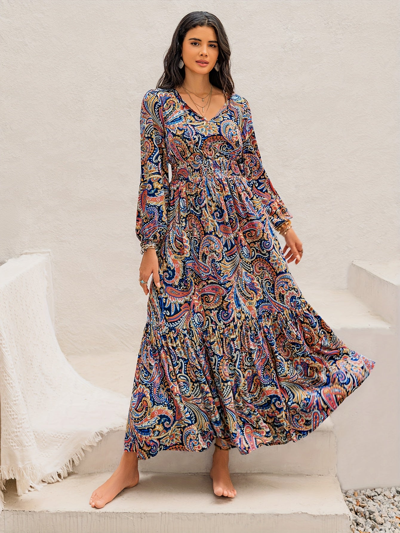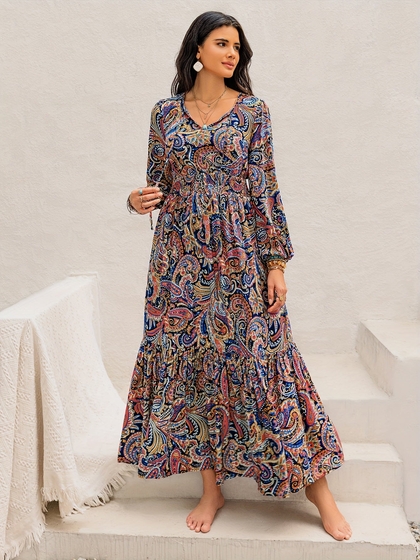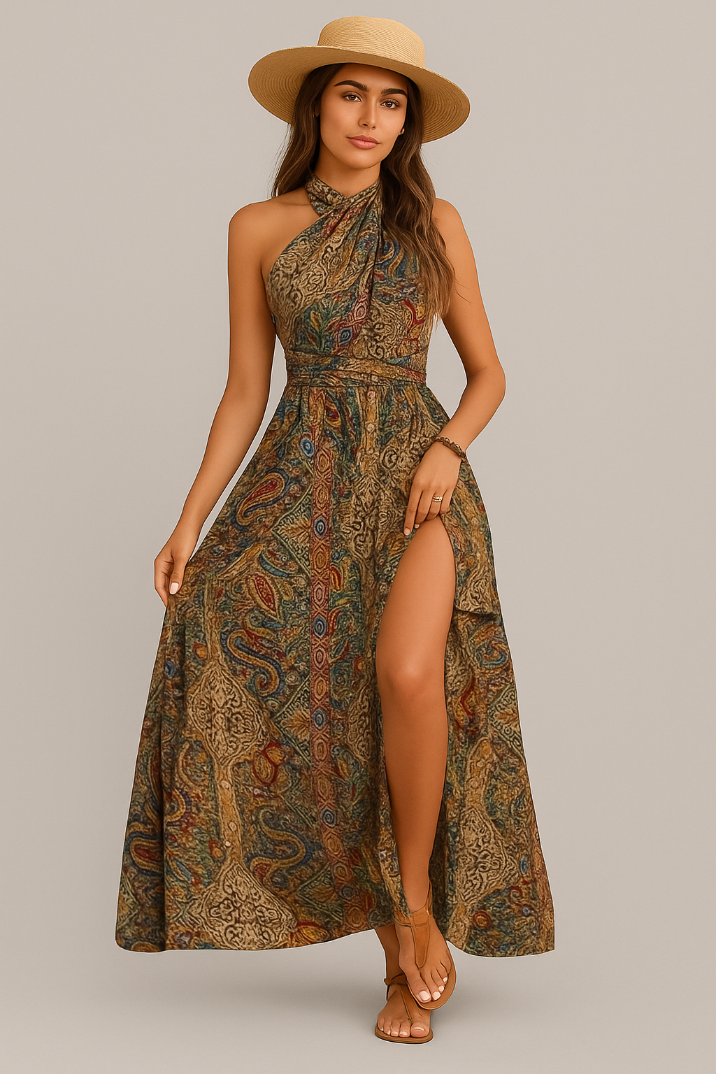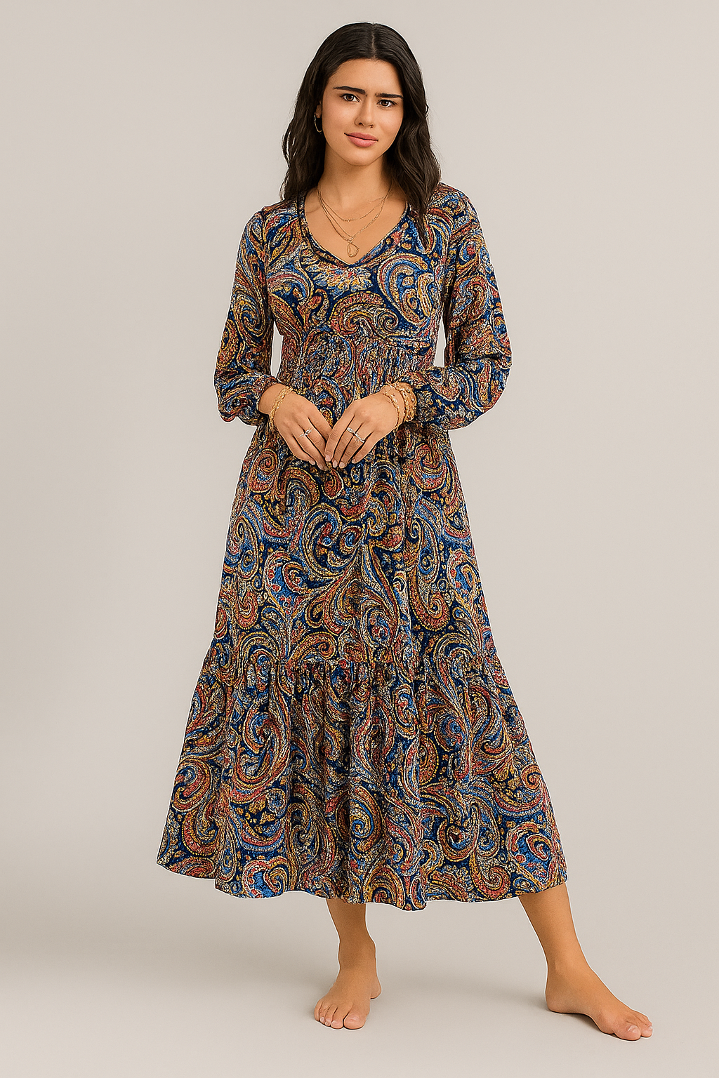 Robe longue bohème fluide femme – imprimé patchwork d’été