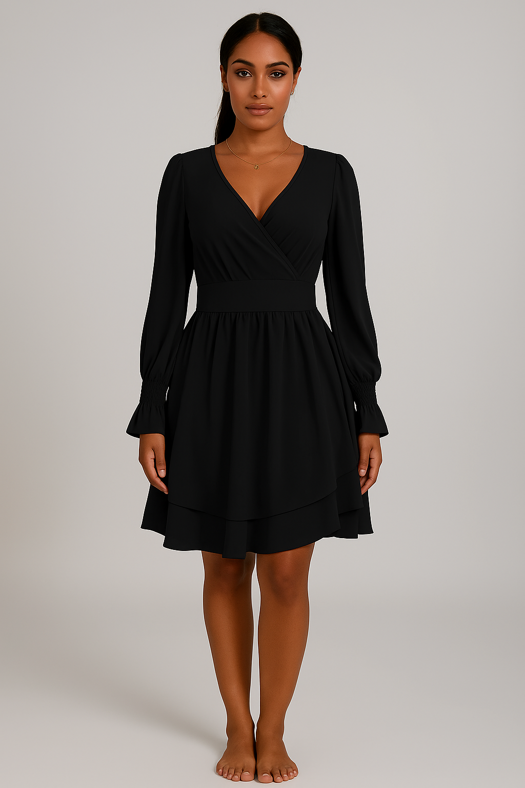 Pensée pour sublimer chaque geste, cette robe portefeuille manches longues chic combine modernité et sensualité. Facile à associer avec des talons, des bijoux dorés ou un sac élégant, elle incarne une féminité naturelle et un style intemporel.